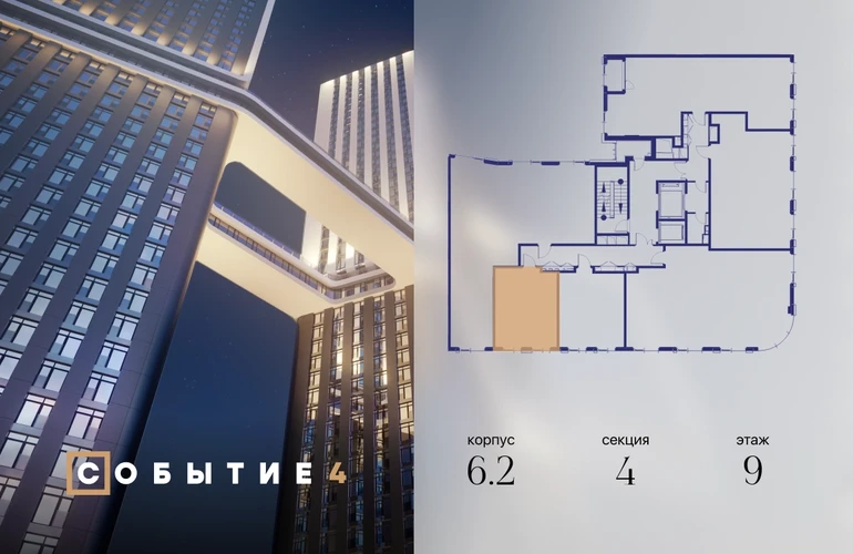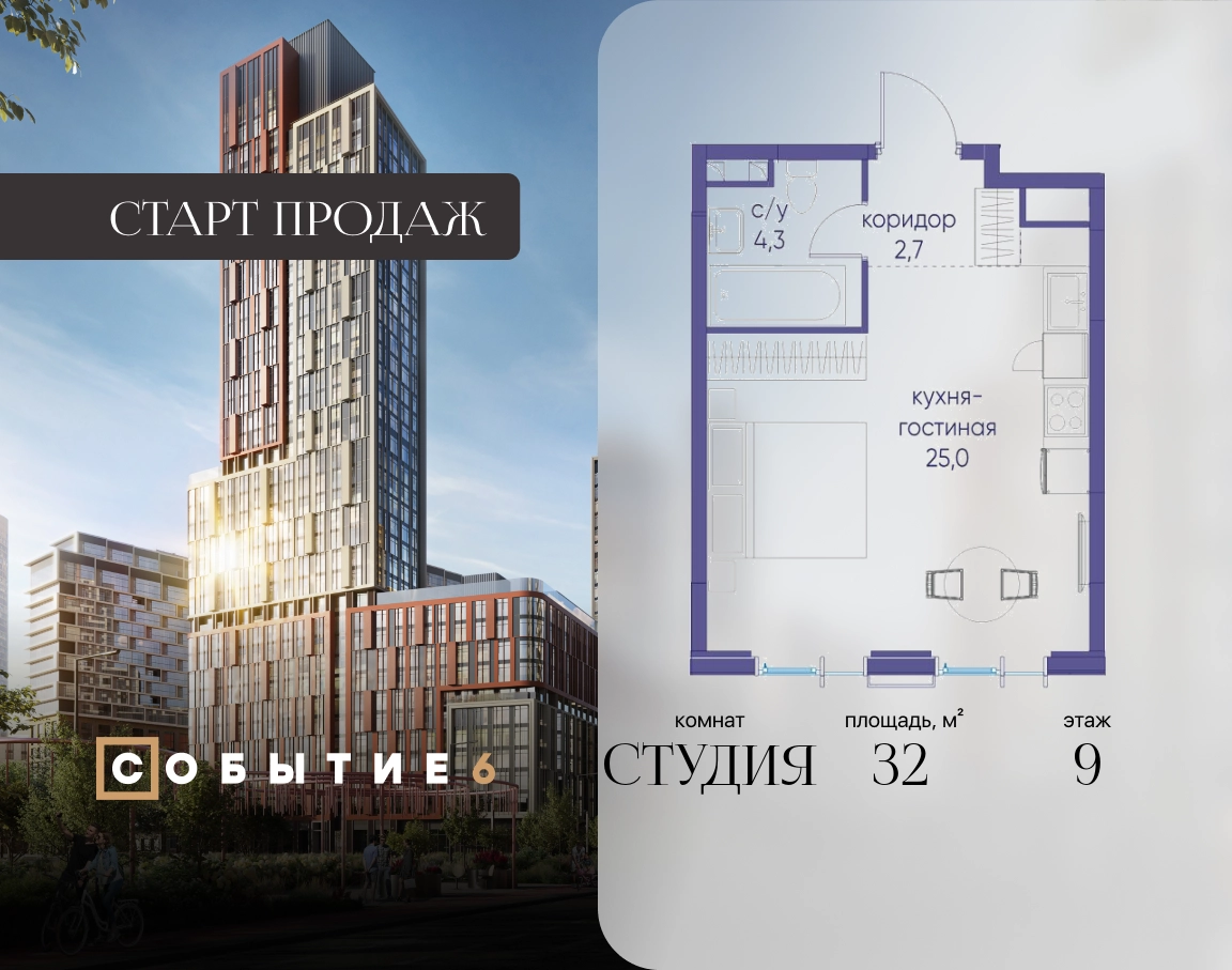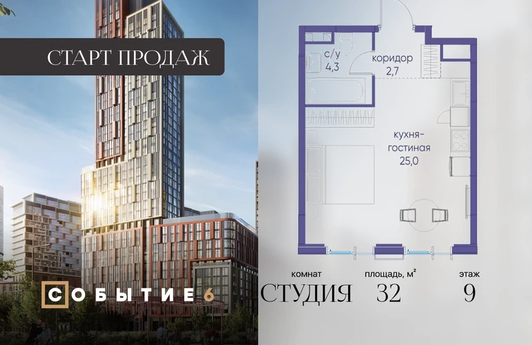 Продаётся квартира-студия от застройщика: общая площадь 32.00 м², жилая 20.00 м², кухня 5.00 м², 9-й этаж, жилой квартал «Событие-6», корпус 2 (секция 4) Срок сдачи: 1 квартал 2029 года. Позвоните сейчас и забронируйте квартиру! Продуманный до деталей. Созданный для жизни, полной счастливых событий. Парк-квартал СОБЫТИЕ — это жизнь класса премиум в престижном районе на Мосфильмовской улице. Архитектура мирового уровня. Выигрышное расположение на границе природного комплекса «Долина реки Раменки». Все для комфортной жизни и досуга: от детсадов и школ до ресторанов и медцентров. И новая точка притяжения — уже готовый парк «Событие» с пространствами активности для всех возрастов и интересов. Особенности квартала: • «Парящие» мосты и парк под облаками - уникальный дом с самыми завораживающими видами из окон «в пол» • Собственный парк — сразу за порогом! • Архитектурная концепция от известных международных бюро LDA Design и UHA London • Инфраструктура «тапочной доступности»: в кафе, школу, магазин — за пару минут! • Внутренний двор — настоящее продолжение вашего дома: закрытая охраняемая территория без машин, развивающие детские площадки, воркауты-зоны для тех, кто хочет быть в форме, площади для праздников и посиделок с соседями.О застройщике