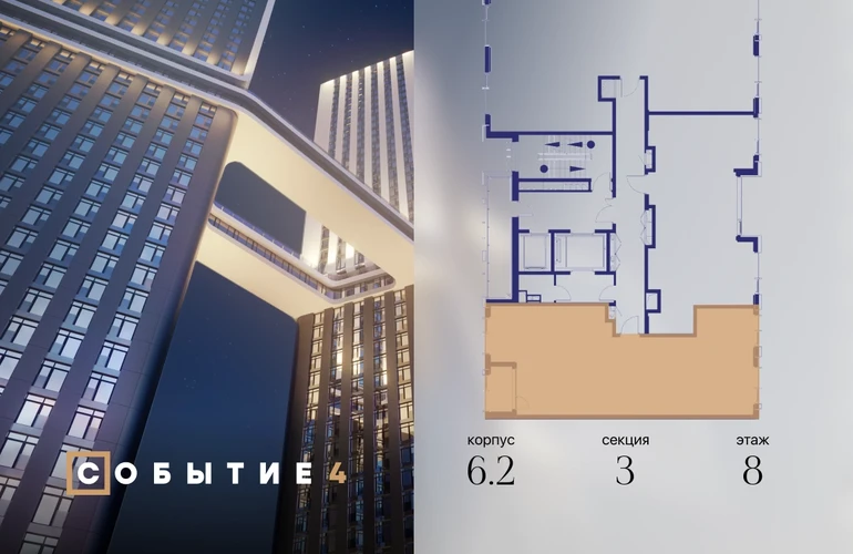 Продаётся 3-комнатная квартира от застройщика: общая площадь 78.90 м², жилая 41.50 м², кухня 20.70 м², 8-й этаж, жилой квартал «Событие-6», корпус 2 (секция 3) Срок сдачи: 1 квартал 2029 года. Позвоните сейчас и забронируйте квартиру! Продуманный до деталей. Созданный для жизни, полной счастливых событий. Парк-квартал СОБЫТИЕ — это жизнь класса премиум в престижном районе на Мосфильмовской улице. Архитектура мирового уровня. Выигрышное расположение на границе природного комплекса «Долина реки Раменки». Все для комфортной жизни и досуга: от детсадов и школ до ресторанов и медцентров. И новая точка притяжения — уже готовый парк «Событие» с пространствами активности для всех возрастов и интересов. Особенности квартала: • «Парящие» мосты и парк под облаками - уникальный дом с самыми завораживающими видами из окон «в пол» • Собственный парк — сразу за порогом! • Архитектурная концепция от известных международных бюро LDA Design и UHA London • Инфраструктура «тапочной доступности»: в кафе, школу, магазин — за пару минут! • Внутренний двор — настоящее продолжение вашего дома: закрытая охраняемая территория без машин, развивающие детские площадки, воркауты-зоны для тех, кто хочет быть в форме, площади для праздников и посиделок с соседями.О застройщике