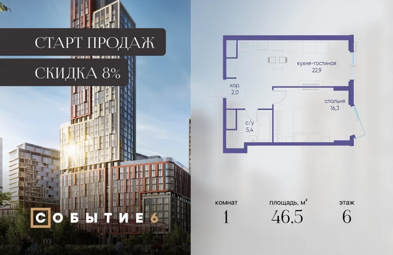 Продаётся 1-комнатная квартира от застройщика: общая площадь 46.50 м², жилая 16.30 м², кухня 22.90 м², 6-й этаж, жилой квартал «Событие-6», корпус 2 (секция 1) Срок сдачи: 1 квартал 2029 года. Позвоните сейчас и забронируйте квартиру! Продуманный до деталей. Созданный для жизни, полной счастливых событий. Парк-квартал СОБЫТИЕ — это жизнь класса премиум в престижном районе на Мосфильмовской улице. Архитектура мирового уровня. Выигрышное расположение на границе природного комплекса «Долина реки Раменки». Все для комфортной жизни и досуга: от детсадов и школ до ресторанов и медцентров. И новая точка притяжения — уже готовый парк «Событие» с пространствами активности для всех возрастов и интересов. Особенности квартала: • «Парящие» мосты и парк под облаками - уникальный дом с самыми завораживающими видами из окон «в пол» • Собственный парк — сразу за порогом! • Архитектурная концепция от известных международных бюро LDA Design и UHA London • Инфраструктура «тапочной доступности»: в кафе, школу, магазин — за пару минут! • Внутренний двор — настоящее продолжение вашего дома: закрытая охраняемая территория без машин, развивающие детские площадки, воркауты-зоны для тех, кто хочет быть в форме, площади для праздников и посиделок с соседями.О застройщике