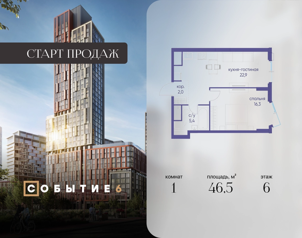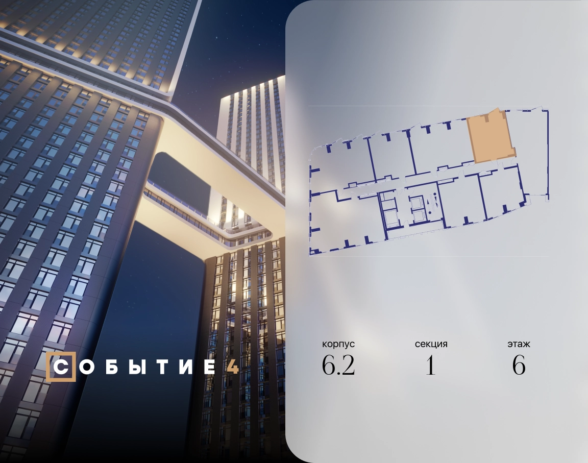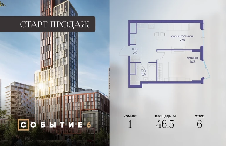 Продаётся 1-комнатная квартира от застройщика: общая площадь 46.50 м², жилая 16.30 м², кухня 22.90 м², 6-й этаж, жилой квартал «Событие-6», корпус 2 (секция 1) Срок сдачи: 1 квартал 2029 года. Позвоните сейчас и забронируйте квартиру! Продуманный до деталей. Созданный для жизни, полной счастливых событий. Парк-квартал СОБЫТИЕ — это жизнь класса премиум в престижном районе на Мосфильмовской улице. Архитектура мирового уровня. Выигрышное расположение на границе природного комплекса «Долина реки Раменки». Все для комфортной жизни и досуга: от детсадов и школ до ресторанов и медцентров. И новая точка притяжения — уже готовый парк «Событие» с пространствами активности для всех возрастов и интересов. Особенности квартала: • «Парящие» мосты и парк под облаками - уникальный дом с самыми завораживающими видами из окон «в пол» • Собственный парк — сразу за порогом! • Архитектурная концепция от известных международных бюро LDA Design и UHA London • Инфраструктура «тапочной доступности»: в кафе, школу, магазин — за пару минут! • Внутренний двор — настоящее продолжение вашего дома: закрытая охраняемая территория без машин, развивающие детские площадки, воркауты-зоны для тех, кто хочет быть в форме, площади для праздников и посиделок с соседями.О застройщике