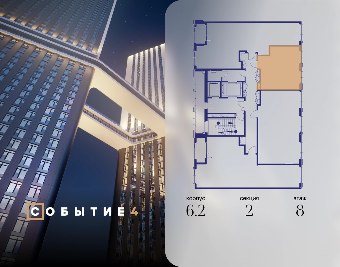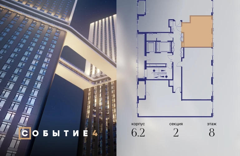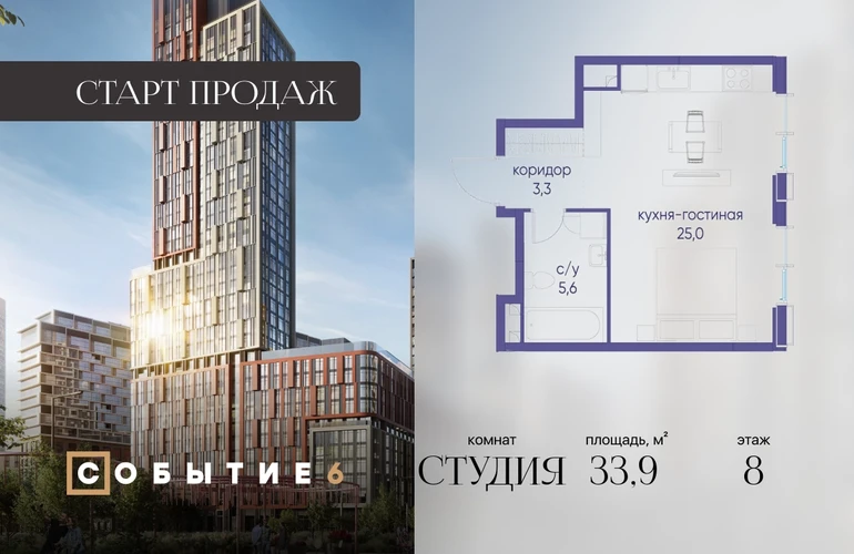Продаётся квартира-студия от застройщика: общая площадь 33.90 м², жилая 20.00 м², кухня 5.00 м², 8-й этаж, жилой квартал «Событие-6», корпус 2 (секция 2) Срок сдачи: 1 квартал 2029 года. Позвоните сейчас и забронируйте квартиру! Продуманный до деталей. Созданный для жизни, полной счастливых событий. Парк-квартал СОБЫТИЕ — это жизнь класса премиум в престижном районе на Мосфильмовской улице. Архитектура мирового уровня. Выигрышное расположение на границе природного комплекса «Долина реки Раменки». Все для комфортной жизни и досуга: от детсадов и школ до ресторанов и медцентров. И новая точка притяжения — уже готовый парк «Событие» с пространствами активности для всех возрастов и интересов. Особенности квартала: • «Парящие» мосты и парк под облаками - уникальный дом с самыми завораживающими видами из окон «в пол» • Собственный парк — сразу за порогом! • Архитектурная концепция от известных международных бюро LDA Design и UHA London • Инфраструктура «тапочной доступности»: в кафе, школу, магазин — за пару минут! • Внутренний двор — настоящее продолжение вашего дома: закрытая охраняемая территория без машин, развивающие детские площадки, воркауты-зоны для тех, кто хочет быть в форме, площади для праздников и посиделок с соседями.О застройщике
