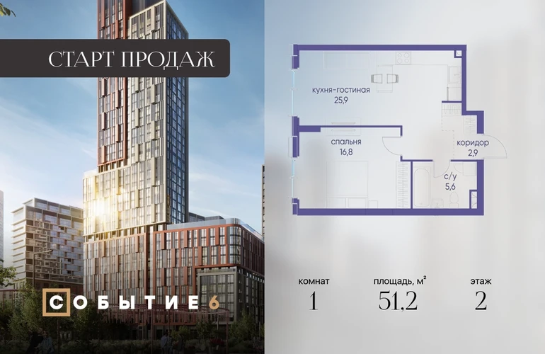 Продаётся 1-комнатная квартира от застройщика: общая площадь 51.20 м², жилая 16.80 м², кухня 25.90 м², 2-й этаж, жилой квартал «Событие-6», корпус 2 (секция 1) Срок сдачи: 1 квартал 2029 года. Позвоните сейчас и забронируйте квартиру! Продуманный до деталей. Созданный для жизни, полной счастливых событий. Парк-квартал СОБЫТИЕ — это жизнь класса премиум в престижном районе на Мосфильмовской улице. Архитектура мирового уровня. Выигрышное расположение на границе природного комплекса «Долина реки Раменки». Все для комфортной жизни и досуга: от детсадов и школ до ресторанов и медцентров. И новая точка притяжения — уже готовый парк «Событие» с пространствами активности для всех возрастов и интересов. Особенности квартала: • «Парящие» мосты и парк под облаками - уникальный дом с самыми завораживающими видами из окон «в пол» • Собственный парк — сразу за порогом! • Архитектурная концепция от известных международных бюро LDA Design и UHA London • Инфраструктура «тапочной доступности»: в кафе, школу, магазин — за пару минут! • Внутренний двор — настоящее продолжение вашего дома: закрытая охраняемая территория без машин, развивающие детские площадки, воркауты-зоны для тех, кто хочет быть в форме, площади для праздников и посиделок с соседями.О застройщике