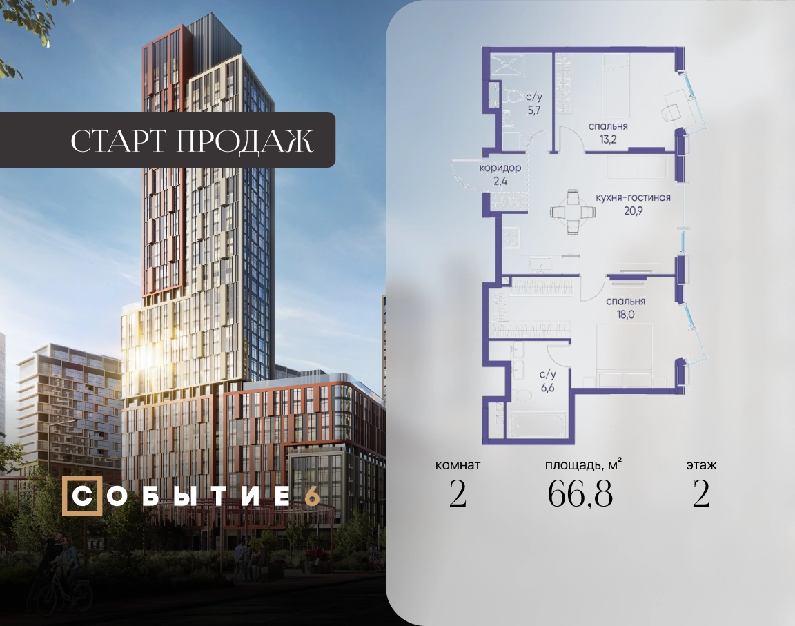Продаётся 2-комнатная квартира от застройщика: общая площадь 66.80 м², жилая 31.20 м², кухня 20.90 м², 2-й этаж, жилой квартал «Событие-6», корпус 2 (секция 3) Срок сдачи: 1 квартал 2029 года. Позвоните сейчас и забронируйте квартиру! Продуманный до деталей. Созданный для жизни, полной счастливых событий. Парк-квартал СОБЫТИЕ — это жизнь класса премиум в престижном районе на Мосфильмовской улице. Архитектура мирового уровня. Выигрышное расположение на границе природного комплекса «Долина реки Раменки». Все для комфортной жизни и досуга: от детсадов и школ до ресторанов и медцентров. И новая точка притяжения — уже готовый парк «Событие» с пространствами активности для всех возрастов и интересов. Особенности квартала: • «Парящие» мосты и парк под облаками - уникальный дом с самыми завораживающими видами из окон «в пол» • Собственный парк — сразу за порогом! • Архитектурная концепция от известных международных бюро LDA Design и UHA London • Инфраструктура «тапочной доступности»: в кафе, школу, магазин — за пару минут! • Внутренний двор — настоящее продолжение вашего дома: закрытая охраняемая территория без машин, развивающие детские площадки, воркауты-зоны для тех, кто хочет быть в форме, площади для праздников и посиделок с соседями.О застройщике