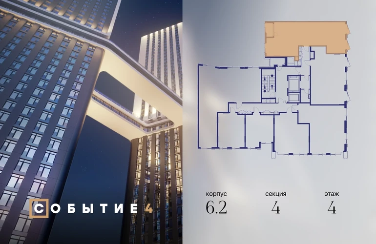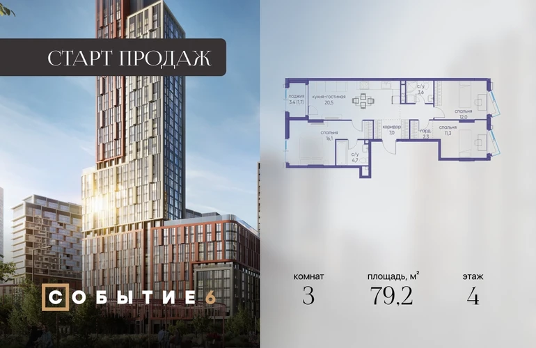 Продаётся 3-комнатная квартира от застройщика: общая площадь 79.20 м², жилая 39.40 м², кухня 20.50 м², 4-й этаж, жилой квартал «Событие-6», корпус 2 (секция 4) Срок сдачи: 1 квартал 2029 года. Позвоните сейчас и забронируйте квартиру! Продуманный до деталей. Созданный для жизни, полной счастливых событий. Парк-квартал СОБЫТИЕ — это жизнь класса премиум в престижном районе на Мосфильмовской улице. Архитектура мирового уровня. Выигрышное расположение на границе природного комплекса «Долина реки Раменки». Все для комфортной жизни и досуга: от детсадов и школ до ресторанов и медцентров. И новая точка притяжения — уже готовый парк «Событие» с пространствами активности для всех возрастов и интересов. Особенности квартала: • «Парящие» мосты и парк под облаками - уникальный дом с самыми завораживающими видами из окон «в пол» • Собственный парк — сразу за порогом! • Архитектурная концепция от известных международных бюро LDA Design и UHA London • Инфраструктура «тапочной доступности»: в кафе, школу, магазин — за пару минут! • Внутренний двор — настоящее продолжение вашего дома: закрытая охраняемая территория без машин, развивающие детские площадки, воркауты-зоны для тех, кто хочет быть в форме, площади для праздников и посиделок с соседями.О застройщике