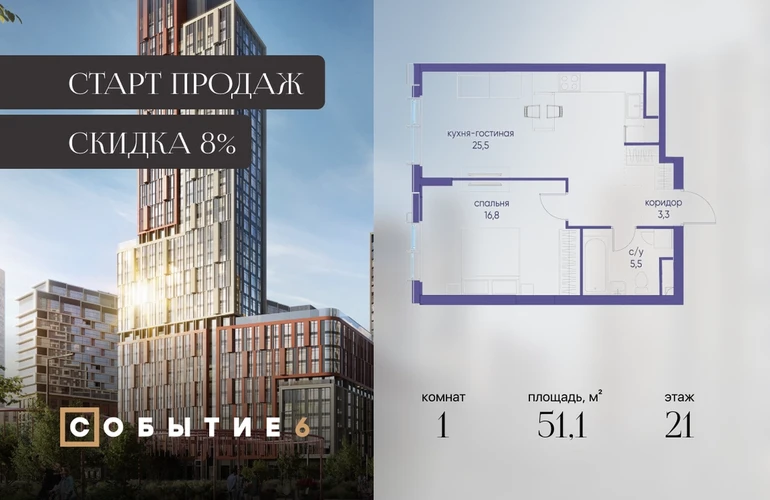 Продаётся 1-комнатная квартира от застройщика: общая площадь 51.10 м², жилая 16.80 м², кухня 25.50 м², 21-й этаж, жилой квартал «Событие-6», корпус 2 (секция 1) Срок сдачи: 1 квартал 2029 года. Позвоните сейчас и забронируйте квартиру! Продуманный до деталей. Созданный для жизни, полной счастливых событий. Парк-квартал СОБЫТИЕ — это жизнь класса премиум в престижном районе на Мосфильмовской улице. Архитектура мирового уровня. Выигрышное расположение на границе природного комплекса «Долина реки Раменки». Все для комфортной жизни и досуга: от детсадов и школ до ресторанов и медцентров. И новая точка притяжения — уже готовый парк «Событие» с пространствами активности для всех возрастов и интересов. Особенности квартала: • «Парящие» мосты и парк под облаками - уникальный дом с самыми завораживающими видами из окон «в пол» • Собственный парк — сразу за порогом! • Архитектурная концепция от известных международных бюро LDA Design и UHA London • Инфраструктура «тапочной доступности»: в кафе, школу, магазин — за пару минут! • Внутренний двор — настоящее продолжение вашего дома: закрытая охраняемая территория без машин, развивающие детские площадки, воркауты-зоны для тех, кто хочет быть в форме, площади для праздников и посиделок с соседями.О застройщике