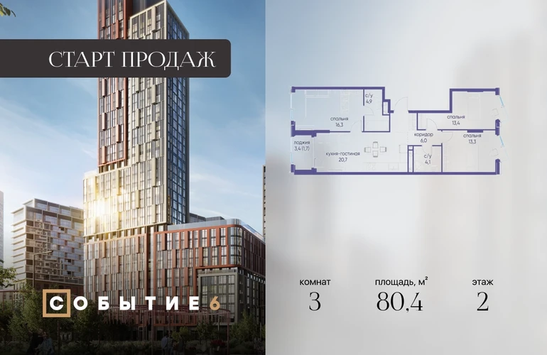 Продаётся 3-комнатная квартира от застройщика: общая площадь 80.40 м², жилая 43.00 м², кухня 20.70 м², 2-й этаж, жилой квартал «Событие-6», корпус 2 (секция 3) Срок сдачи: 1 квартал 2029 года. Позвоните сейчас и забронируйте квартиру! Продуманный до деталей. Созданный для жизни, полной счастливых событий. Парк-квартал СОБЫТИЕ — это жизнь класса премиум в престижном районе на Мосфильмовской улице. Архитектура мирового уровня. Выигрышное расположение на границе природного комплекса «Долина реки Раменки». Все для комфортной жизни и досуга: от детсадов и школ до ресторанов и медцентров. И новая точка притяжения — уже готовый парк «Событие» с пространствами активности для всех возрастов и интересов. Особенности квартала: • «Парящие» мосты и парк под облаками - уникальный дом с самыми завораживающими видами из окон «в пол» • Собственный парк — сразу за порогом! • Архитектурная концепция от известных международных бюро LDA Design и UHA London • Инфраструктура «тапочной доступности»: в кафе, школу, магазин — за пару минут! • Внутренний двор — настоящее продолжение вашего дома: закрытая охраняемая территория без машин, развивающие детские площадки, воркауты-зоны для тех, кто хочет быть в форме, площади для праздников и посиделок с соседями.О застройщике
