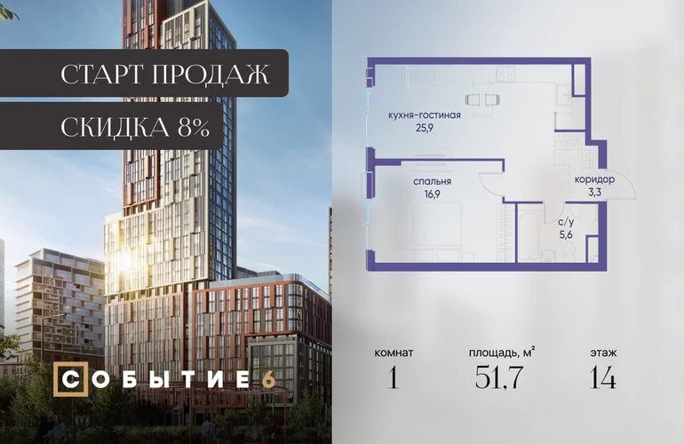 Продаётся 1-комнатная квартира от застройщика: общая площадь 51.70 м², жилая 16.90 м², кухня 25.90 м², 14-й этаж, жилой квартал «Событие-6», корпус 2 (секция 1) Срок сдачи: 1 квартал 2029 года. Позвоните сейчас и забронируйте квартиру! Продуманный до деталей. Созданный для жизни, полной счастливых событий. Парк-квартал СОБЫТИЕ — это жизнь класса премиум в престижном районе на Мосфильмовской улице. Архитектура мирового уровня. Выигрышное расположение на границе природного комплекса «Долина реки Раменки». Все для комфортной жизни и досуга: от детсадов и школ до ресторанов и медцентров. И новая точка притяжения — уже готовый парк «Событие» с пространствами активности для всех возрастов и интересов. Особенности квартала: • «Парящие» мосты и парк под облаками - уникальный дом с самыми завораживающими видами из окон «в пол» • Собственный парк — сразу за порогом! • Архитектурная концепция от известных международных бюро LDA Design и UHA London • Инфраструктура «тапочной доступности»: в кафе, школу, магазин — за пару минут! • Внутренний двор — настоящее продолжение вашего дома: закрытая охраняемая территория без машин, развивающие детские площадки, воркауты-зоны для тех, кто хочет быть в форме, площади для праздников и посиделок с соседями.О застройщике