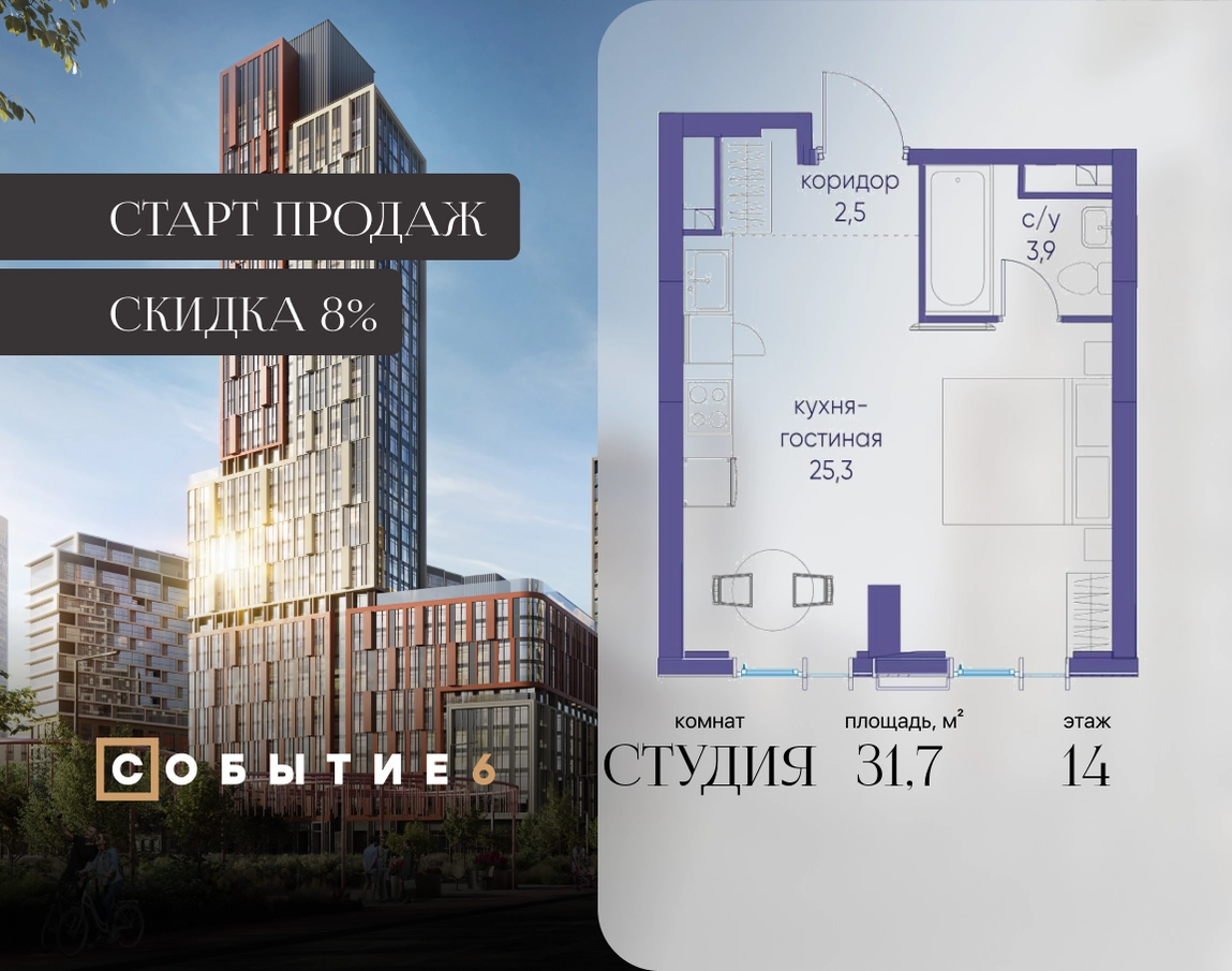 Продаётся квартира-студия от застройщика: общая площадь 31.70 м², жилая 20.30 м², кухня 5.00 м², 14-й этаж, жилой квартал «Событие-6», корпус 2 (секция 5) Срок сдачи: 1 квартал 2029 года. Позвоните сейчас и забронируйте квартиру! Продуманный до деталей. Созданный для жизни, полной счастливых событий. Парк-квартал СОБЫТИЕ — это жизнь класса премиум в престижном районе на Мосфильмовской улице. Архитектура мирового уровня. Выигрышное расположение на границе природного комплекса «Долина реки Раменки». Все для комфортной жизни и досуга: от детсадов и школ до ресторанов и медцентров. И новая точка притяжения — уже готовый парк «Событие» с пространствами активности для всех возрастов и интересов. Особенности квартала: • «Парящие» мосты и парк под облаками - уникальный дом с самыми завораживающими видами из окон «в пол» • Собственный парк — сразу за порогом! • Архитектурная концепция от известных международных бюро LDA Design и UHA London • Инфраструктура «тапочной доступности»: в кафе, школу, магазин — за пару минут! • Внутренний двор — настоящее продолжение вашего дома: закрытая охраняемая территория без машин, развивающие детские площадки, воркауты-зоны для тех, кто хочет быть в форме, площади для праздников и посиделок с соседями.О застройщике