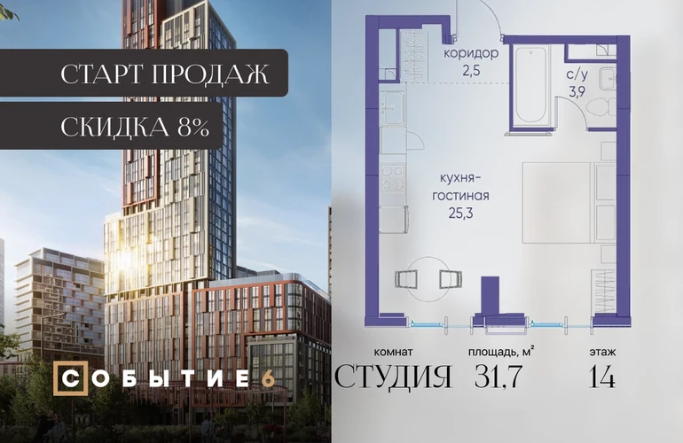 Продаётся квартира-студия от застройщика: общая площадь 31.70 м², жилая 20.30 м², кухня 5.00 м², 14-й этаж, жилой квартал «Событие-6», корпус 2 (секция 5) Срок сдачи: 1 квартал 2029 года. Позвоните сейчас и забронируйте квартиру! Продуманный до деталей. Созданный для жизни, полной счастливых событий. Парк-квартал СОБЫТИЕ — это жизнь класса премиум в престижном районе на Мосфильмовской улице. Архитектура мирового уровня. Выигрышное расположение на границе природного комплекса «Долина реки Раменки». Все для комфортной жизни и досуга: от детсадов и школ до ресторанов и медцентров. И новая точка притяжения — уже готовый парк «Событие» с пространствами активности для всех возрастов и интересов. Особенности квартала: • «Парящие» мосты и парк под облаками - уникальный дом с самыми завораживающими видами из окон «в пол» • Собственный парк — сразу за порогом! • Архитектурная концепция от известных международных бюро LDA Design и UHA London • Инфраструктура «тапочной доступности»: в кафе, школу, магазин — за пару минут! • Внутренний двор — настоящее продолжение вашего дома: закрытая охраняемая территория без машин, развивающие детские площадки, воркауты-зоны для тех, кто хочет быть в форме, площади для праздников и посиделок с соседями.О застройщике