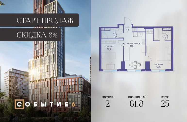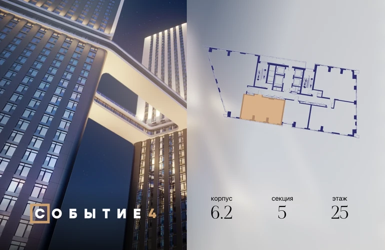 Продаётся 2-комнатная квартира от застройщика: общая площадь 61.80 м², жилая 32.90 м², кухня 17.80 м², 25-й этаж, жилой квартал «Событие-6», корпус 2 (секция 5) Срок сдачи: 1 квартал 2029 года. Позвоните сейчас и забронируйте квартиру! Продуманный до деталей. Созданный для жизни, полной счастливых событий. Парк-квартал СОБЫТИЕ — это жизнь класса премиум в престижном районе на Мосфильмовской улице. Архитектура мирового уровня. Выигрышное расположение на границе природного комплекса «Долина реки Раменки». Все для комфортной жизни и досуга: от детсадов и школ до ресторанов и медцентров. И новая точка притяжения — уже готовый парк «Событие» с пространствами активности для всех возрастов и интересов. Особенности квартала: • «Парящие» мосты и парк под облаками - уникальный дом с самыми завораживающими видами из окон «в пол» • Собственный парк — сразу за порогом! • Архитектурная концепция от известных международных бюро LDA Design и UHA London • Инфраструктура «тапочной доступности»: в кафе, школу, магазин — за пару минут! • Внутренний двор — настоящее продолжение вашего дома: закрытая охраняемая территория без машин, развивающие детские площадки, воркауты-зоны для тех, кто хочет быть в форме, площади для праздников и посиделок с соседями.О застройщике