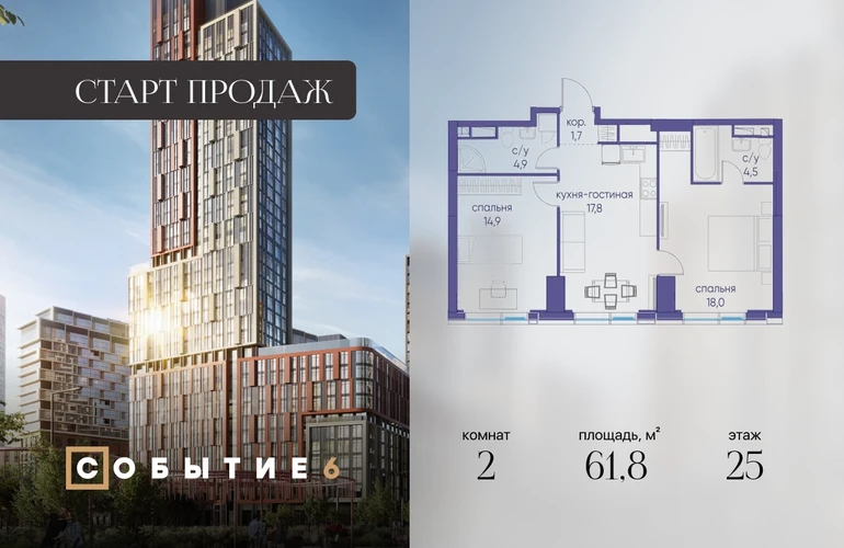 Продаётся 2-комнатная квартира от застройщика: общая площадь 61.80 м², жилая 32.90 м², кухня 17.80 м², 25-й этаж, жилой квартал «Событие-6», корпус 2 (секция 5) Срок сдачи: 1 квартал 2029 года. Позвоните сейчас и забронируйте квартиру! Продуманный до деталей. Созданный для жизни, полной счастливых событий. Парк-квартал СОБЫТИЕ — это жизнь класса премиум в престижном районе на Мосфильмовской улице. Архитектура мирового уровня. Выигрышное расположение на границе природного комплекса «Долина реки Раменки». Все для комфортной жизни и досуга: от детсадов и школ до ресторанов и медцентров. И новая точка притяжения — уже готовый парк «Событие» с пространствами активности для всех возрастов и интересов. Особенности квартала: • «Парящие» мосты и парк под облаками - уникальный дом с самыми завораживающими видами из окон «в пол» • Собственный парк — сразу за порогом! • Архитектурная концепция от известных международных бюро LDA Design и UHA London • Инфраструктура «тапочной доступности»: в кафе, школу, магазин — за пару минут! • Внутренний двор — настоящее продолжение вашего дома: закрытая охраняемая территория без машин, развивающие детские площадки, воркауты-зоны для тех, кто хочет быть в форме, площади для праздников и посиделок с соседями.О застройщике