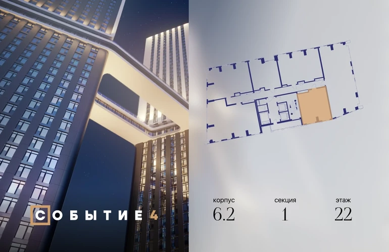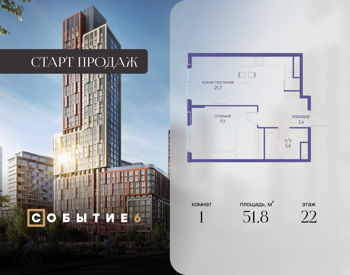 Продаётся 1-комнатная квартира от застройщика: общая площадь 51.80 м², жилая 17.10 м², кухня 25.70 м², 22-й этаж, жилой квартал «Событие-6», корпус 2 (секция 1) Срок сдачи: 1 квартал 2029 года. Позвоните сейчас и забронируйте квартиру! Продуманный до деталей. Созданный для жизни, полной счастливых событий. Парк-квартал СОБЫТИЕ — это жизнь класса премиум в престижном районе на Мосфильмовской улице. Архитектура мирового уровня. Выигрышное расположение на границе природного комплекса «Долина реки Раменки». Все для комфортной жизни и досуга: от детсадов и школ до ресторанов и медцентров. И новая точка притяжения — уже готовый парк «Событие» с пространствами активности для всех возрастов и интересов. Особенности квартала: • «Парящие» мосты и парк под облаками - уникальный дом с самыми завораживающими видами из окон «в пол» • Собственный парк — сразу за порогом! • Архитектурная концепция от известных международных бюро LDA Design и UHA London • Инфраструктура «тапочной доступности»: в кафе, школу, магазин — за пару минут! • Внутренний двор — настоящее продолжение вашего дома: закрытая охраняемая территория без машин, развивающие детские площадки, воркауты-зоны для тех, кто хочет быть в форме, площади для праздников и посиделок с соседями.О застройщике