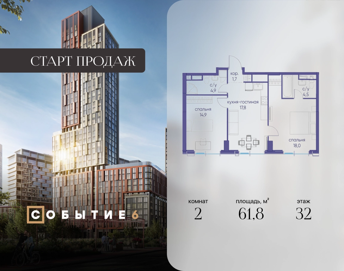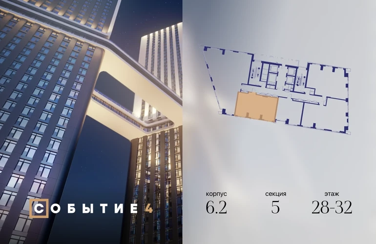 Продаётся 2-комнатная квартира от застройщика: общая площадь 61.80 м², жилая 32.90 м², кухня 17.80 м², 32-й этаж, жилой квартал «Событие-6», корпус 2 (секция 5) Срок сдачи: 1 квартал 2029 года. Позвоните сейчас и забронируйте квартиру! Продуманный до деталей. Созданный для жизни, полной счастливых событий. Парк-квартал СОБЫТИЕ — это жизнь класса премиум в престижном районе на Мосфильмовской улице. Архитектура мирового уровня. Выигрышное расположение на границе природного комплекса «Долина реки Раменки». Все для комфортной жизни и досуга: от детсадов и школ до ресторанов и медцентров. И новая точка притяжения — уже готовый парк «Событие» с пространствами активности для всех возрастов и интересов. Особенности квартала: • «Парящие» мосты и парк под облаками - уникальный дом с самыми завораживающими видами из окон «в пол» • Собственный парк — сразу за порогом! • Архитектурная концепция от известных международных бюро LDA Design и UHA London • Инфраструктура «тапочной доступности»: в кафе, школу, магазин — за пару минут! • Внутренний двор — настоящее продолжение вашего дома: закрытая охраняемая территория без машин, развивающие детские площадки, воркауты-зоны для тех, кто хочет быть в форме, площади для праздников и посиделок с соседями.О застройщике