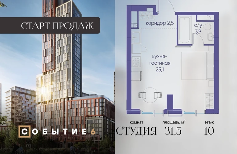 Продаётся квартира-студия от застройщика: общая площадь 31.50 м², жилая 20.10 м², кухня 5.00 м², 10-й этаж, жилой квартал «Событие-6», корпус 2 (секция 5) Срок сдачи: 1 квартал 2029 года. Позвоните сейчас и забронируйте квартиру! Продуманный до деталей. Созданный для жизни, полной счастливых событий. Парк-квартал СОБЫТИЕ — это жизнь класса премиум в престижном районе на Мосфильмовской улице. Архитектура мирового уровня. Выигрышное расположение на границе природного комплекса «Долина реки Раменки». Все для комфортной жизни и досуга: от детсадов и школ до ресторанов и медцентров. И новая точка притяжения — уже готовый парк «Событие» с пространствами активности для всех возрастов и интересов. Особенности квартала: • «Парящие» мосты и парк под облаками - уникальный дом с самыми завораживающими видами из окон «в пол» • Собственный парк — сразу за порогом! • Архитектурная концепция от известных международных бюро LDA Design и UHA London • Инфраструктура «тапочной доступности»: в кафе, школу, магазин — за пару минут! • Внутренний двор — настоящее продолжение вашего дома: закрытая охраняемая территория без машин, развивающие детские площадки, воркауты-зоны для тех, кто хочет быть в форме, площади для праздников и посиделок с соседями.О застройщике