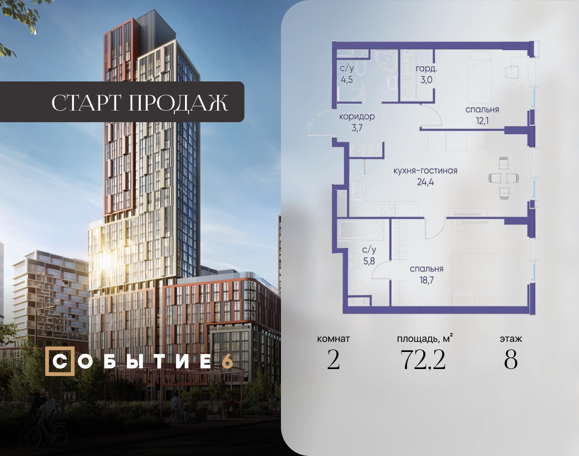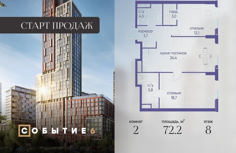 Продаётся 2-комнатная квартира от застройщика: общая площадь 72.20 м², жилая 30.80 м², кухня 24.40 м², 8-й этаж, жилой квартал «Событие-6», корпус 2 (секция 1) Срок сдачи: 1 квартал 2029 года. Позвоните сейчас и забронируйте квартиру! Продуманный до деталей. Созданный для жизни, полной счастливых событий. Парк-квартал СОБЫТИЕ — это жизнь класса премиум в престижном районе на Мосфильмовской улице. Архитектура мирового уровня. Выигрышное расположение на границе природного комплекса «Долина реки Раменки». Все для комфортной жизни и досуга: от детсадов и школ до ресторанов и медцентров. И новая точка притяжения — уже готовый парк «Событие» с пространствами активности для всех возрастов и интересов. Особенности квартала: • «Парящие» мосты и парк под облаками - уникальный дом с самыми завораживающими видами из окон «в пол» • Собственный парк — сразу за порогом! • Архитектурная концепция от известных международных бюро LDA Design и UHA London • Инфраструктура «тапочной доступности»: в кафе, школу, магазин — за пару минут! • Внутренний двор — настоящее продолжение вашего дома: закрытая охраняемая территория без машин, развивающие детские площадки, воркауты-зоны для тех, кто хочет быть в форме, площади для праздников и посиделок с соседями.О застройщике