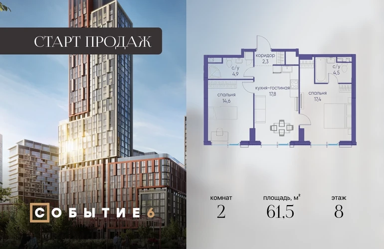 Продаётся 2-комнатная квартира от застройщика: общая площадь 61.50 м², жилая 32.00 м², кухня 17.80 м², 8-й этаж, жилой квартал «Событие-6», корпус 2 (секция 5) Срок сдачи: 1 квартал 2029 года. Позвоните сейчас и забронируйте квартиру! Продуманный до деталей. Созданный для жизни, полной счастливых событий. Парк-квартал СОБЫТИЕ — это жизнь класса премиум в престижном районе на Мосфильмовской улице. Архитектура мирового уровня. Выигрышное расположение на границе природного комплекса «Долина реки Раменки». Все для комфортной жизни и досуга: от детсадов и школ до ресторанов и медцентров. И новая точка притяжения — уже готовый парк «Событие» с пространствами активности для всех возрастов и интересов. Особенности квартала: • «Парящие» мосты и парк под облаками - уникальный дом с самыми завораживающими видами из окон «в пол» • Собственный парк — сразу за порогом! • Архитектурная концепция от известных международных бюро LDA Design и UHA London • Инфраструктура «тапочной доступности»: в кафе, школу, магазин — за пару минут! • Внутренний двор — настоящее продолжение вашего дома: закрытая охраняемая территория без машин, развивающие детские площадки, воркауты-зоны для тех, кто хочет быть в форме, площади для праздников и посиделок с соседями.О застройщике