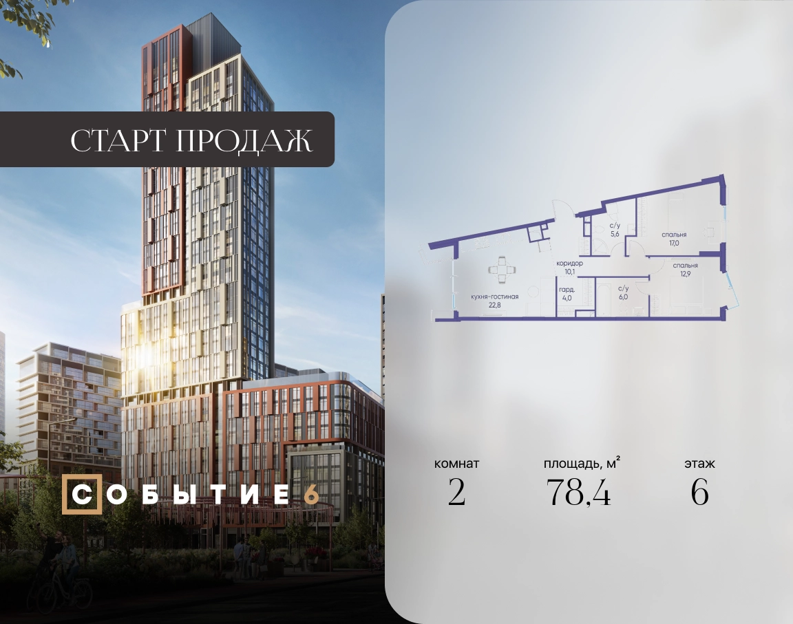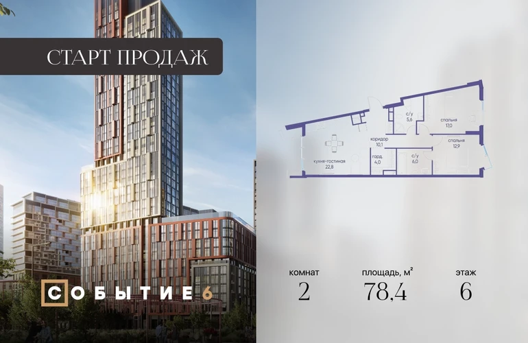 Продаётся 2-комнатная квартира от застройщика: общая площадь 78.40 м², жилая 29.90 м², кухня 22.80 м², 6-й этаж, жилой квартал «Событие-6», корпус 2 (секция 1) Срок сдачи: 1 квартал 2029 года. Позвоните сейчас и забронируйте квартиру! Продуманный до деталей. Созданный для жизни, полной счастливых событий. Парк-квартал СОБЫТИЕ — это жизнь класса премиум в престижном районе на Мосфильмовской улице. Архитектура мирового уровня. Выигрышное расположение на границе природного комплекса «Долина реки Раменки». Все для комфортной жизни и досуга: от детсадов и школ до ресторанов и медцентров. И новая точка притяжения — уже готовый парк «Событие» с пространствами активности для всех возрастов и интересов. Особенности квартала: • «Парящие» мосты и парк под облаками - уникальный дом с самыми завораживающими видами из окон «в пол» • Собственный парк — сразу за порогом! • Архитектурная концепция от известных международных бюро LDA Design и UHA London • Инфраструктура «тапочной доступности»: в кафе, школу, магазин — за пару минут! • Внутренний двор — настоящее продолжение вашего дома: закрытая охраняемая территория без машин, развивающие детские площадки, воркауты-зоны для тех, кто хочет быть в форме, площади для праздников и посиделок с соседями.О застройщике