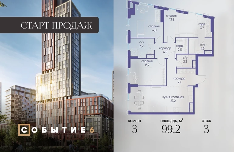 Продаётся 3-комнатная квартира от застройщика: общая площадь 99.20 м², жилая 41.70 м², кухня 23.20 м², 3-й этаж, жилой квартал «Событие-6», корпус 2 (секция 1) Срок сдачи: 1 квартал 2029 года. Позвоните сейчас и забронируйте квартиру! Продуманный до деталей. Созданный для жизни, полной счастливых событий. Парк-квартал СОБЫТИЕ — это жизнь класса премиум в престижном районе на Мосфильмовской улице. Архитектура мирового уровня. Выигрышное расположение на границе природного комплекса «Долина реки Раменки». Все для комфортной жизни и досуга: от детсадов и школ до ресторанов и медцентров. И новая точка притяжения — уже готовый парк «Событие» с пространствами активности для всех возрастов и интересов. Особенности квартала: • «Парящие» мосты и парк под облаками - уникальный дом с самыми завораживающими видами из окон «в пол» • Собственный парк — сразу за порогом! • Архитектурная концепция от известных международных бюро LDA Design и UHA London • Инфраструктура «тапочной доступности»: в кафе, школу, магазин — за пару минут! • Внутренний двор — настоящее продолжение вашего дома: закрытая охраняемая территория без машин, развивающие детские площадки, воркауты-зоны для тех, кто хочет быть в форме, площади для праздников и посиделок с соседями.О застройщике