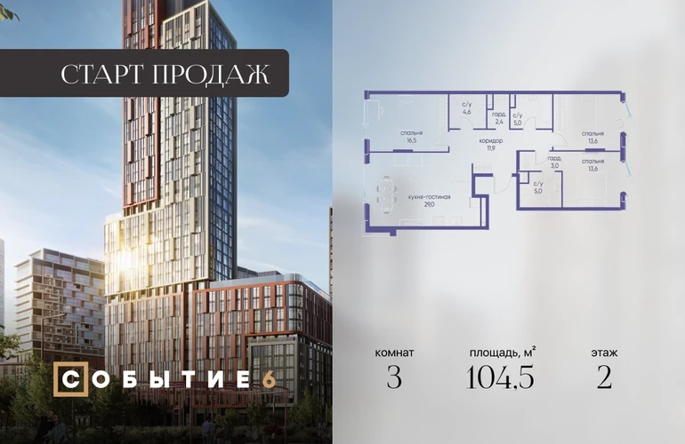 Продаётся 3-комнатная квартира от застройщика: общая площадь 104.50 м², жилая 43.70 м², кухня 29.00 м², 2-й этаж, жилой квартал «Событие-6», корпус 2 (секция 3) Срок сдачи: 1 квартал 2029 года. Позвоните сейчас и забронируйте квартиру! Продуманный до деталей. Созданный для жизни, полной счастливых событий. Парк-квартал СОБЫТИЕ — это жизнь класса премиум в престижном районе на Мосфильмовской улице. Архитектура мирового уровня. Выигрышное расположение на границе природного комплекса «Долина реки Раменки». Все для комфортной жизни и досуга: от детсадов и школ до ресторанов и медцентров. И новая точка притяжения — уже готовый парк «Событие» с пространствами активности для всех возрастов и интересов. Особенности квартала: • «Парящие» мосты и парк под облаками - уникальный дом с самыми завораживающими видами из окон «в пол» • Собственный парк — сразу за порогом! • Архитектурная концепция от известных международных бюро LDA Design и UHA London • Инфраструктура «тапочной доступности»: в кафе, школу, магазин — за пару минут! • Внутренний двор — настоящее продолжение вашего дома: закрытая охраняемая территория без машин, развивающие детские площадки, воркауты-зоны для тех, кто хочет быть в форме, площади для праздников и посиделок с соседями.О застройщике