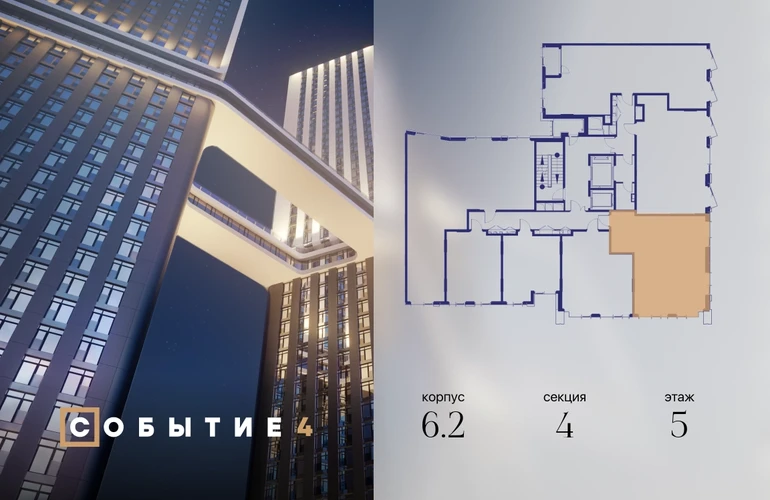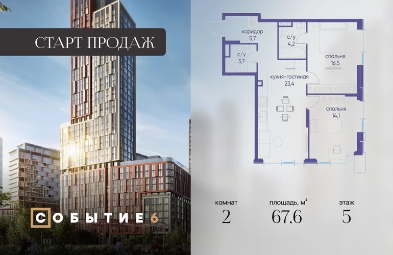 Продаётся 2-комнатная квартира от застройщика: общая площадь 67.60 м², жилая 30.60 м², кухня 23.40 м², 5-й этаж, жилой квартал «Событие-6», корпус 2 (секция 4) Срок сдачи: 1 квартал 2029 года. Позвоните сейчас и забронируйте квартиру! Продуманный до деталей. Созданный для жизни, полной счастливых событий. Парк-квартал СОБЫТИЕ — это жизнь класса премиум в престижном районе на Мосфильмовской улице. Архитектура мирового уровня. Выигрышное расположение на границе природного комплекса «Долина реки Раменки». Все для комфортной жизни и досуга: от детсадов и школ до ресторанов и медцентров. И новая точка притяжения — уже готовый парк «Событие» с пространствами активности для всех возрастов и интересов. Особенности квартала: • «Парящие» мосты и парк под облаками - уникальный дом с самыми завораживающими видами из окон «в пол» • Собственный парк — сразу за порогом! • Архитектурная концепция от известных международных бюро LDA Design и UHA London • Инфраструктура «тапочной доступности»: в кафе, школу, магазин — за пару минут! • Внутренний двор — настоящее продолжение вашего дома: закрытая охраняемая территория без машин, развивающие детские площадки, воркауты-зоны для тех, кто хочет быть в форме, площади для праздников и посиделок с соседями.О застройщике