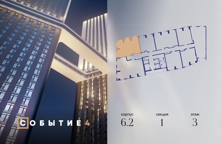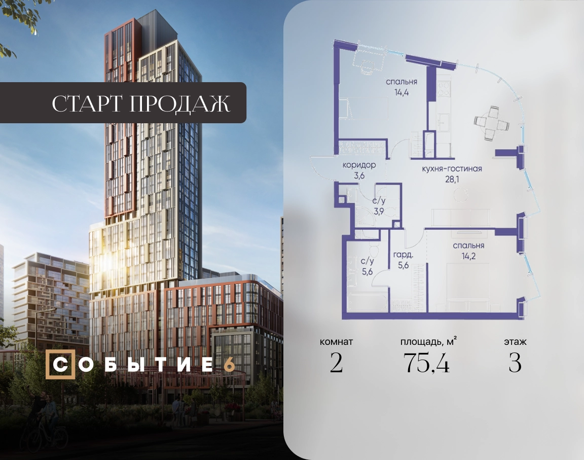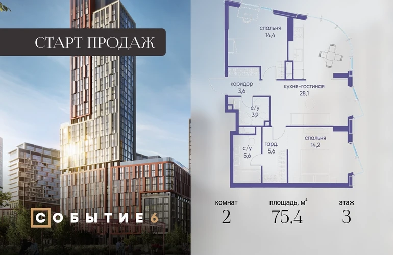 Продаётся 2-комнатная квартира от застройщика: общая площадь 75.40 м², жилая 28.60 м², кухня 28.10 м², 3-й этаж, жилой квартал «Событие-6», корпус 2 (секция 1) Срок сдачи: 1 квартал 2029 года. Позвоните сейчас и забронируйте квартиру! Продуманный до деталей. Созданный для жизни, полной счастливых событий. Парк-квартал СОБЫТИЕ — это жизнь класса премиум в престижном районе на Мосфильмовской улице. Архитектура мирового уровня. Выигрышное расположение на границе природного комплекса «Долина реки Раменки». Все для комфортной жизни и досуга: от детсадов и школ до ресторанов и медцентров. И новая точка притяжения — уже готовый парк «Событие» с пространствами активности для всех возрастов и интересов. Особенности квартала: • «Парящие» мосты и парк под облаками - уникальный дом с самыми завораживающими видами из окон «в пол» • Собственный парк — сразу за порогом! • Архитектурная концепция от известных международных бюро LDA Design и UHA London • Инфраструктура «тапочной доступности»: в кафе, школу, магазин — за пару минут! • Внутренний двор — настоящее продолжение вашего дома: закрытая охраняемая территория без машин, развивающие детские площадки, воркауты-зоны для тех, кто хочет быть в форме, площади для праздников и посиделок с соседями.О застройщике