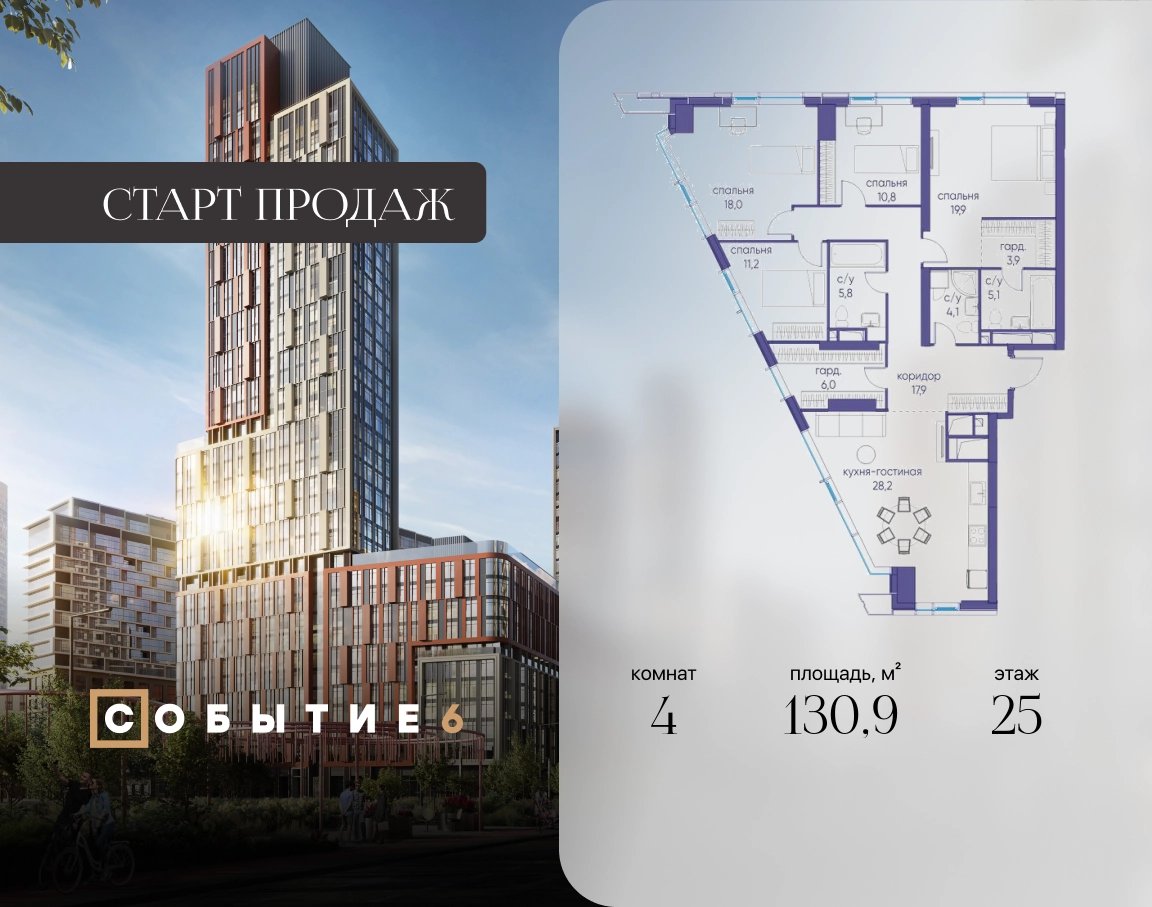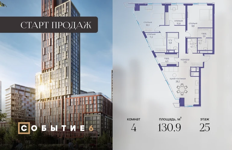 Продаётся 4-комнатная квартира от застройщика: общая площадь 130.90 м², жилая 59.90 м², кухня 28.20 м², 25-й этаж, жилой квартал «Событие-6», корпус 2 (секция 5) Срок сдачи: 1 квартал 2029 года. Позвоните сейчас и забронируйте квартиру! Продуманный до деталей. Созданный для жизни, полной счастливых событий. Парк-квартал СОБЫТИЕ — это жизнь класса премиум в престижном районе на Мосфильмовской улице. Архитектура мирового уровня. Выигрышное расположение на границе природного комплекса «Долина реки Раменки». Все для комфортной жизни и досуга: от детсадов и школ до ресторанов и медцентров. И новая точка притяжения — уже готовый парк «Событие» с пространствами активности для всех возрастов и интересов. Особенности квартала: • «Парящие» мосты и парк под облаками - уникальный дом с самыми завораживающими видами из окон «в пол» • Собственный парк — сразу за порогом! • Архитектурная концепция от известных международных бюро LDA Design и UHA London • Инфраструктура «тапочной доступности»: в кафе, школу, магазин — за пару минут! • Внутренний двор — настоящее продолжение вашего дома: закрытая охраняемая территория без машин, развивающие детские площадки, воркауты-зоны для тех, кто хочет быть в форме, площади для праздников и посиделок с соседями.О застройщике