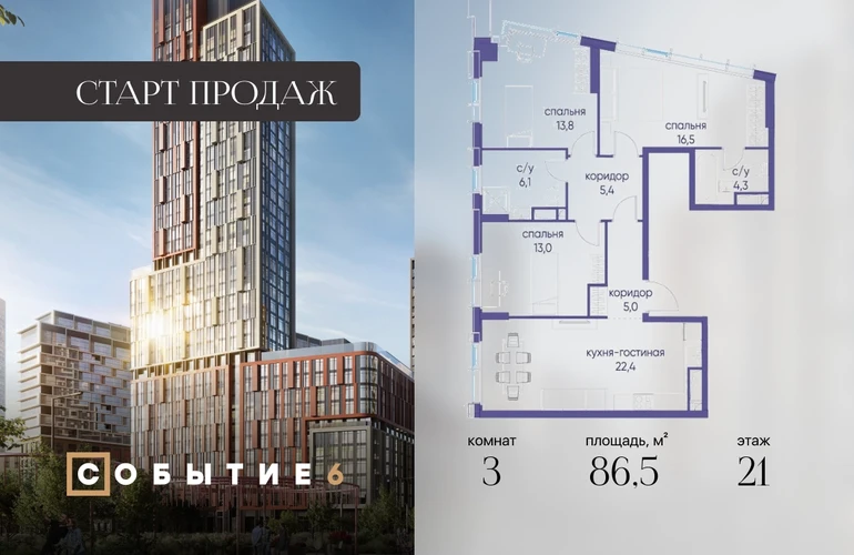 Продаётся 3-комнатная квартира от застройщика: общая площадь 86.50 м², жилая 43.30 м², кухня 22.40 м², 21-й этаж, жилой квартал «Событие-6», корпус 2 (секция 1) Срок сдачи: 1 квартал 2029 года. Позвоните сейчас и забронируйте квартиру! Продуманный до деталей. Созданный для жизни, полной счастливых событий. Парк-квартал СОБЫТИЕ — это жизнь класса премиум в престижном районе на Мосфильмовской улице. Архитектура мирового уровня. Выигрышное расположение на границе природного комплекса «Долина реки Раменки». Все для комфортной жизни и досуга: от детсадов и школ до ресторанов и медцентров. И новая точка притяжения — уже готовый парк «Событие» с пространствами активности для всех возрастов и интересов. Особенности квартала: • «Парящие» мосты и парк под облаками - уникальный дом с самыми завораживающими видами из окон «в пол» • Собственный парк — сразу за порогом! • Архитектурная концепция от известных международных бюро LDA Design и UHA London • Инфраструктура «тапочной доступности»: в кафе, школу, магазин — за пару минут! • Внутренний двор — настоящее продолжение вашего дома: закрытая охраняемая территория без машин, развивающие детские площадки, воркауты-зоны для тех, кто хочет быть в форме, площади для праздников и посиделок с соседями.О застройщике