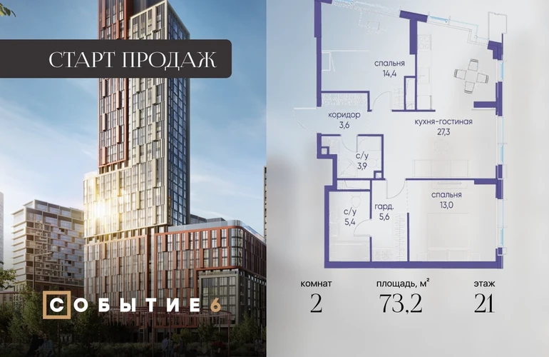 Продаётся 2-комнатная квартира от застройщика: общая площадь 73.20 м², жилая 27.40 м², кухня 27.30 м², 21-й этаж, жилой квартал «Событие-6», корпус 2 (секция 1) Срок сдачи: 1 квартал 2029 года. Позвоните сейчас и забронируйте квартиру! Продуманный до деталей. Созданный для жизни, полной счастливых событий. Парк-квартал СОБЫТИЕ — это жизнь класса премиум в престижном районе на Мосфильмовской улице. Архитектура мирового уровня. Выигрышное расположение на границе природного комплекса «Долина реки Раменки». Все для комфортной жизни и досуга: от детсадов и школ до ресторанов и медцентров. И новая точка притяжения — уже готовый парк «Событие» с пространствами активности для всех возрастов и интересов. Особенности квартала: • «Парящие» мосты и парк под облаками - уникальный дом с самыми завораживающими видами из окон «в пол» • Собственный парк — сразу за порогом! • Архитектурная концепция от известных международных бюро LDA Design и UHA London • Инфраструктура «тапочной доступности»: в кафе, школу, магазин — за пару минут! • Внутренний двор — настоящее продолжение вашего дома: закрытая охраняемая территория без машин, развивающие детские площадки, воркауты-зоны для тех, кто хочет быть в форме, площади для праздников и посиделок с соседями.О застройщике
