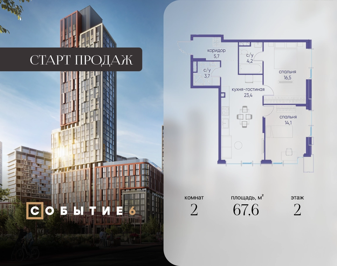 Продаётся 2-комнатная квартира от застройщика: общая площадь 67.60 м², жилая 30.60 м², кухня 23.40 м², 2-й этаж, жилой квартал «Событие-6», корпус 2 (секция 4) Срок сдачи: 1 квартал 2029 года. Позвоните сейчас и забронируйте квартиру! Продуманный до деталей. Созданный для жизни, полной счастливых событий. Парк-квартал СОБЫТИЕ — это жизнь класса премиум в престижном районе на Мосфильмовской улице. Архитектура мирового уровня. Выигрышное расположение на границе природного комплекса «Долина реки Раменки». Все для комфортной жизни и досуга: от детсадов и школ до ресторанов и медцентров. И новая точка притяжения — уже готовый парк «Событие» с пространствами активности для всех возрастов и интересов. Особенности квартала: • «Парящие» мосты и парк под облаками - уникальный дом с самыми завораживающими видами из окон «в пол» • Собственный парк — сразу за порогом! • Архитектурная концепция от известных международных бюро LDA Design и UHA London • Инфраструктура «тапочной доступности»: в кафе, школу, магазин — за пару минут! • Внутренний двор — настоящее продолжение вашего дома: закрытая охраняемая территория без машин, развивающие детские площадки, воркауты-зоны для тех, кто хочет быть в форме, площади для праздников и посиделок с соседями.О застройщике