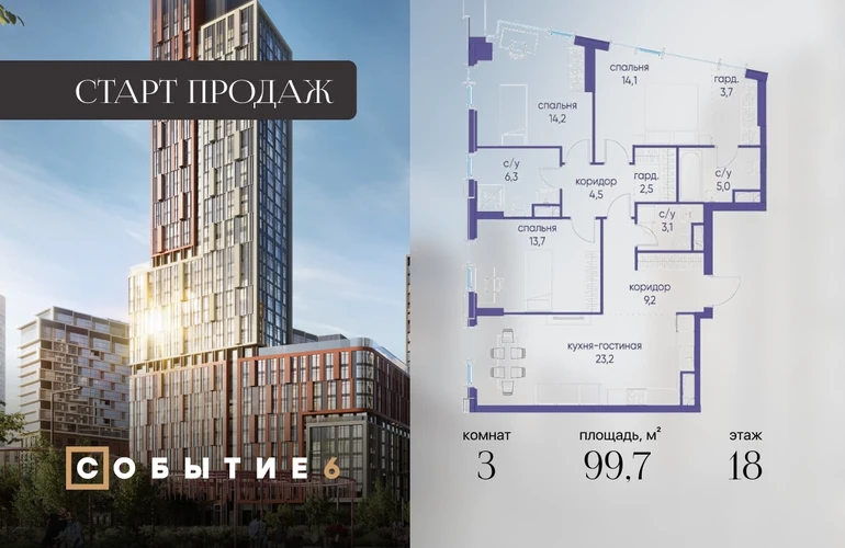 Продаётся 3-комнатная квартира от застройщика: общая площадь 99.70 м², жилая 42.00 м², кухня 23.20 м², 18-й этаж, жилой квартал «Событие-6», корпус 2 (секция 1) Срок сдачи: 1 квартал 2029 года. Позвоните сейчас и забронируйте квартиру! Продуманный до деталей. Созданный для жизни, полной счастливых событий. Парк-квартал СОБЫТИЕ — это жизнь класса премиум в престижном районе на Мосфильмовской улице. Архитектура мирового уровня. Выигрышное расположение на границе природного комплекса «Долина реки Раменки». Все для комфортной жизни и досуга: от детсадов и школ до ресторанов и медцентров. И новая точка притяжения — уже готовый парк «Событие» с пространствами активности для всех возрастов и интересов. Особенности квартала: • «Парящие» мосты и парк под облаками - уникальный дом с самыми завораживающими видами из окон «в пол» • Собственный парк — сразу за порогом! • Архитектурная концепция от известных международных бюро LDA Design и UHA London • Инфраструктура «тапочной доступности»: в кафе, школу, магазин — за пару минут! • Внутренний двор — настоящее продолжение вашего дома: закрытая охраняемая территория без машин, развивающие детские площадки, воркауты-зоны для тех, кто хочет быть в форме, площади для праздников и посиделок с соседями.О застройщике