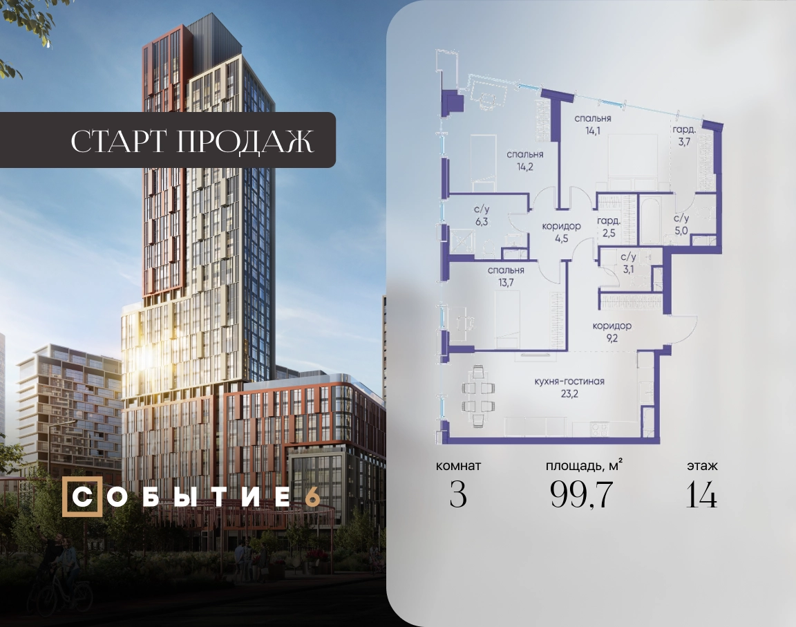 Продаётся 3-комнатная квартира от застройщика: общая площадь 99.70 м², жилая 42.00 м², кухня 23.20 м², 14-й этаж, жилой квартал «Событие-6», корпус 2 (секция 1) Срок сдачи: 1 квартал 2029 года. Позвоните сейчас и забронируйте квартиру! Продуманный до деталей. Созданный для жизни, полной счастливых событий. Парк-квартал СОБЫТИЕ — это жизнь класса премиум в престижном районе на Мосфильмовской улице. Архитектура мирового уровня. Выигрышное расположение на границе природного комплекса «Долина реки Раменки». Все для комфортной жизни и досуга: от детсадов и школ до ресторанов и медцентров. И новая точка притяжения — уже готовый парк «Событие» с пространствами активности для всех возрастов и интересов. Особенности квартала: • «Парящие» мосты и парк под облаками - уникальный дом с самыми завораживающими видами из окон «в пол» • Собственный парк — сразу за порогом! • Архитектурная концепция от известных международных бюро LDA Design и UHA London • Инфраструктура «тапочной доступности»: в кафе, школу, магазин — за пару минут! • Внутренний двор — настоящее продолжение вашего дома: закрытая охраняемая территория без машин, развивающие детские площадки, воркауты-зоны для тех, кто хочет быть в форме, площади для праздников и посиделок с соседями.О застройщике