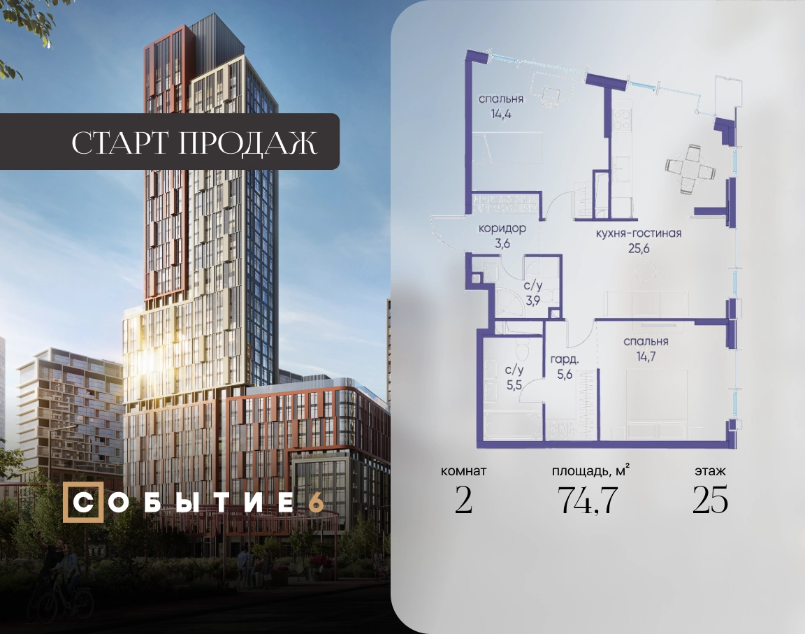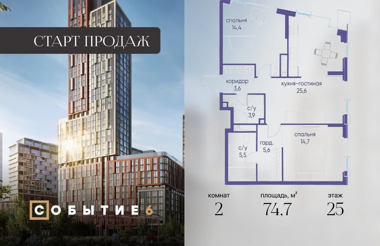 Продаётся 2-комнатная квартира от застройщика: общая площадь 74.70 м², жилая 29.10 м², кухня 25.60 м², 25-й этаж, жилой квартал «Событие-6», корпус 2 (секция 1) Срок сдачи: 1 квартал 2029 года. Позвоните сейчас и забронируйте квартиру! Продуманный до деталей. Созданный для жизни, полной счастливых событий. Парк-квартал СОБЫТИЕ — это жизнь класса премиум в престижном районе на Мосфильмовской улице. Архитектура мирового уровня. Выигрышное расположение на границе природного комплекса «Долина реки Раменки». Все для комфортной жизни и досуга: от детсадов и школ до ресторанов и медцентров. И новая точка притяжения — уже готовый парк «Событие» с пространствами активности для всех возрастов и интересов. Особенности квартала: • «Парящие» мосты и парк под облаками - уникальный дом с самыми завораживающими видами из окон «в пол» • Собственный парк — сразу за порогом! • Архитектурная концепция от известных международных бюро LDA Design и UHA London • Инфраструктура «тапочной доступности»: в кафе, школу, магазин — за пару минут! • Внутренний двор — настоящее продолжение вашего дома: закрытая охраняемая территория без машин, развивающие детские площадки, воркауты-зоны для тех, кто хочет быть в форме, площади для праздников и посиделок с соседями.О застройщике