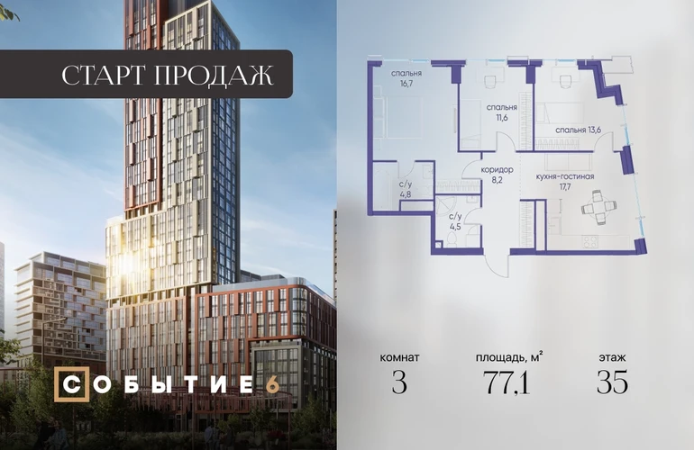 Продаётся 3-комнатная квартира от застройщика: общая площадь 77.10 м², жилая 41.90 м², кухня 17.70 м², 35-й этаж, жилой квартал «Событие-6», корпус 2 (секция 5) Срок сдачи: 1 квартал 2029 года. Позвоните сейчас и забронируйте квартиру! Продуманный до деталей. Созданный для жизни, полной счастливых событий. Парк-квартал СОБЫТИЕ — это жизнь класса премиум в престижном районе на Мосфильмовской улице. Архитектура мирового уровня. Выигрышное расположение на границе природного комплекса «Долина реки Раменки». Все для комфортной жизни и досуга: от детсадов и школ до ресторанов и медцентров. И новая точка притяжения — уже готовый парк «Событие» с пространствами активности для всех возрастов и интересов. Особенности квартала: • «Парящие» мосты и парк под облаками - уникальный дом с самыми завораживающими видами из окон «в пол» • Собственный парк — сразу за порогом! • Архитектурная концепция от известных международных бюро LDA Design и UHA London • Инфраструктура «тапочной доступности»: в кафе, школу, магазин — за пару минут! • Внутренний двор — настоящее продолжение вашего дома: закрытая охраняемая территория без машин, развивающие детские площадки, воркауты-зоны для тех, кто хочет быть в форме, площади для праздников и посиделок с соседями.О застройщике