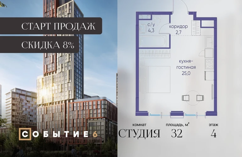 Продаётся квартира-студия от застройщика: общая площадь 32.00 м², жилая 20.00 м², кухня 5.00 м², 4-й этаж, жилой квартал «Событие-6», корпус 2 (секция 4) Срок сдачи: 1 квартал 2029 года. Позвоните сейчас и забронируйте квартиру! Продуманный до деталей. Созданный для жизни, полной счастливых событий. Парк-квартал СОБЫТИЕ — это жизнь класса премиум в престижном районе на Мосфильмовской улице. Архитектура мирового уровня. Выигрышное расположение на границе природного комплекса «Долина реки Раменки». Все для комфортной жизни и досуга: от детсадов и школ до ресторанов и медцентров. И новая точка притяжения — уже готовый парк «Событие» с пространствами активности для всех возрастов и интересов. Особенности квартала: • «Парящие» мосты и парк под облаками - уникальный дом с самыми завораживающими видами из окон «в пол» • Собственный парк — сразу за порогом! • Архитектурная концепция от известных международных бюро LDA Design и UHA London • Инфраструктура «тапочной доступности»: в кафе, школу, магазин — за пару минут! • Внутренний двор — настоящее продолжение вашего дома: закрытая охраняемая территория без машин, развивающие детские площадки, воркауты-зоны для тех, кто хочет быть в форме, площади для праздников и посиделок с соседями.О застройщике