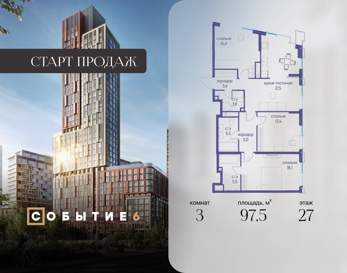 Продаётся 3-комнатная квартира от застройщика: общая площадь 97.50 м², жилая 46.50 м², кухня 27.50 м², 27-й этаж, жилой квартал «Событие-6», корпус 2 (секция 1) Срок сдачи: 1 квартал 2029 года. Позвоните сейчас и забронируйте квартиру! Продуманный до деталей. Созданный для жизни, полной счастливых событий. Парк-квартал СОБЫТИЕ — это жизнь класса премиум в престижном районе на Мосфильмовской улице. Архитектура мирового уровня. Выигрышное расположение на границе природного комплекса «Долина реки Раменки». Все для комфортной жизни и досуга: от детсадов и школ до ресторанов и медцентров. И новая точка притяжения — уже готовый парк «Событие» с пространствами активности для всех возрастов и интересов. Особенности квартала: • «Парящие» мосты и парк под облаками - уникальный дом с самыми завораживающими видами из окон «в пол» • Собственный парк — сразу за порогом! • Архитектурная концепция от известных международных бюро LDA Design и UHA London • Инфраструктура «тапочной доступности»: в кафе, школу, магазин — за пару минут! • Внутренний двор — настоящее продолжение вашего дома: закрытая охраняемая территория без машин, развивающие детские площадки, воркауты-зоны для тех, кто хочет быть в форме, площади для праздников и посиделок с соседями.О застройщике