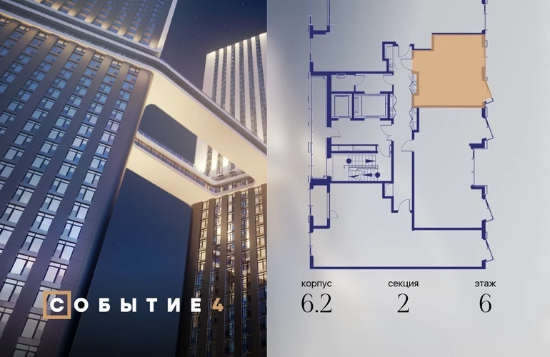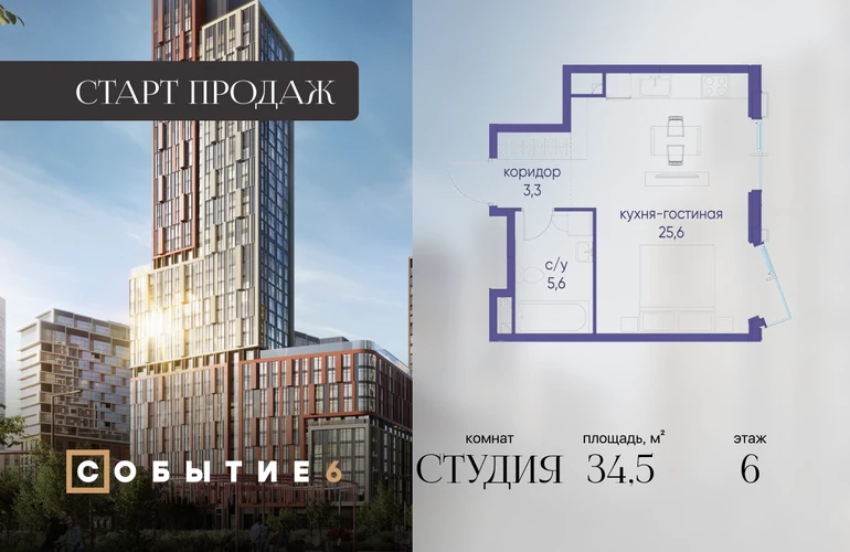 Продаётся квартира-студия от застройщика: общая площадь 34.50 м², жилая 20.00 м², кухня 5.60 м², 6-й этаж, жилой квартал «Событие-6», корпус 2 (секция 2) Срок сдачи: 1 квартал 2029 года. Позвоните сейчас и забронируйте квартиру! Продуманный до деталей. Созданный для жизни, полной счастливых событий. Парк-квартал СОБЫТИЕ — это жизнь класса премиум в престижном районе на Мосфильмовской улице. Архитектура мирового уровня. Выигрышное расположение на границе природного комплекса «Долина реки Раменки». Все для комфортной жизни и досуга: от детсадов и школ до ресторанов и медцентров. И новая точка притяжения — уже готовый парк «Событие» с пространствами активности для всех возрастов и интересов. Особенности квартала: • «Парящие» мосты и парк под облаками - уникальный дом с самыми завораживающими видами из окон «в пол» • Собственный парк — сразу за порогом! • Архитектурная концепция от известных международных бюро LDA Design и UHA London • Инфраструктура «тапочной доступности»: в кафе, школу, магазин — за пару минут! • Внутренний двор — настоящее продолжение вашего дома: закрытая охраняемая территория без машин, развивающие детские площадки, воркауты-зоны для тех, кто хочет быть в форме, площади для праздников и посиделок с соседями.О застройщике