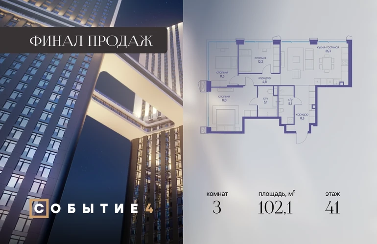 Продаётся 3-комнатная квартира от застройщика: общая площадь 102.10 м², жилая 43.20 м², кухня 23.90 м², 41-й этаж, жилой квартал «Событие-4», корпус 1 (секция 1) Срок сдачи: 1 квартал 2026 года. Позвоните сейчас и забронируйте квартиру! Продуманный до деталей. Созданный для жизни, полной счастливых событий. Парк-квартал СОБЫТИЕ — это жизнь класса премиум в престижном районе на Мосфильмовской улице. Архитектура мирового уровня. Выигрышное расположение на границе природного комплекса «Долина реки Раменки». Все для комфортной жизни и досуга: от детсадов и школ до ресторанов и медцентров. И новая точка притяжения — уже готовый парк «Событие» с пространствами активности для всех возрастов и интересов. Особенности квартала: • «Парящие» мосты и парк под облаками - уникальный дом с самыми завораживающими видами из окон «в пол» • Собственный парк — сразу за порогом! • Архитектурная концепция от известных международных бюро LDA Design и UHA London • Инфраструктура «тапочной доступности»: в кафе, школу, магазин — за пару минут! • Внутренний двор — настоящее продолжение вашего дома: закрытая охраняемая территория без машин, развивающие детские площадки, воркауты-зоны для тех, кто хочет быть в форме, площади для праздников и посиделок с соседями.О застройщике