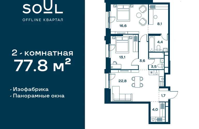 Цены указаны с условием 100% оплаты и стандартной ипотеки. Прямая продажа от застройщика! Продается 2-к. квартира квартира номер 428 общей площадью 77.8 кв.м. на 21-м этаже 21 этажного дома, Корпус 1. С отделкой White Box Max. Проект бизнес-класса SOUL от девелопера FORMA. До метро Сокол 10 мин пешком. Архитектура от британского бюро SimpsonHaugh. Благоустройство дворов — Gillespies. Центральная площадь с фонтанами и местами для отдыха. Оборудованные детские и спортивные площадки. В центре проекта объект культурного наследия — общественное пространство Изофабрика, построенная в 30-х годах по проекту архитектора Георгия Гольца. Здесь будут располагаться мастерские для взрослых и детей, образовательный центр, рестораны и кафе. Квартиры с панорамными окнами, французскими балконами, мастер-спальнями и гардеробными. Высота потолков от 3,1 м. На последнем этаже 3,5 м. В проекте 2 детских сада на 100 и 200 малышей. Фит-рум, коворкинг, дизайнерские лобби, подземный паркинг и келлеры.О застройщике