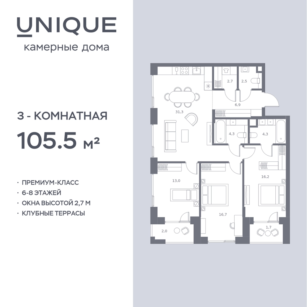 Цены указаны с условием 100% оплаты и стандартной ипотеки. Прямая продажа от застройщика! Продается 3-к. квартира квартира номер 839 общей площадью 105.5 кв.м. на 2-м этаже 8 этажного дома, корпус UNIQUE (премиум-класс). Без отделки. Проект бизнес-класса SOUL от девелопера FORMA. До метро Сокол 10 мин пешком. Архитектура от британского бюро SimpsonHaugh. Благоустройство дворов — Gillespies. Центральная площадь с фонтанами и местами для отдыха. Оборудованные детские и спортивные площадки. В центре проекта объект культурного наследия — общественное пространство Изофабрика, построенная в 30-х годах по проекту архитектора Георгия Гольца. Здесь будут располагаться мастерские для взрослых и детей, образовательный центр, рестораны и кафе. Квартиры с панорамными окнами, французскими балконами, мастер-спальнями и гардеробными. Высота потолков от 3,1 м. На последнем этаже 3,5 м. В проекте 2 детских сада на 100 и 200 малышей. Фит-рум, коворкинг, дизайнерские лобби, подземный паркинг и келлеры.О застройщике