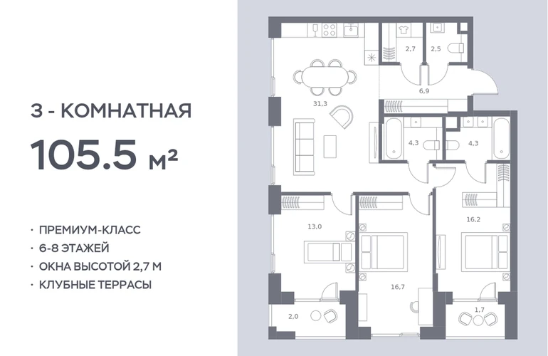 Цены указаны с условием 100% оплаты и стандартной ипотеки. Прямая продажа от застройщика! Продается 3-к. квартира квартира номер 839 общей площадью 105.5 кв.м. на 2-м этаже 8 этажного дома, корпус UNIQUE (премиум-класс). Без отделки. Проект бизнес-класса SOUL от девелопера FORMA. До метро Сокол 10 мин пешком. Архитектура от британского бюро SimpsonHaugh. Благоустройство дворов — Gillespies. Центральная площадь с фонтанами и местами для отдыха. Оборудованные детские и спортивные площадки. В центре проекта объект культурного наследия — общественное пространство Изофабрика, построенная в 30-х годах по проекту архитектора Георгия Гольца. Здесь будут располагаться мастерские для взрослых и детей, образовательный центр, рестораны и кафе. Квартиры с панорамными окнами, французскими балконами, мастер-спальнями и гардеробными. Высота потолков от 3,1 м. На последнем этаже 3,5 м. В проекте 2 детских сада на 100 и 200 малышей. Фит-рум, коворкинг, дизайнерские лобби, подземный паркинг и келлеры.О застройщике