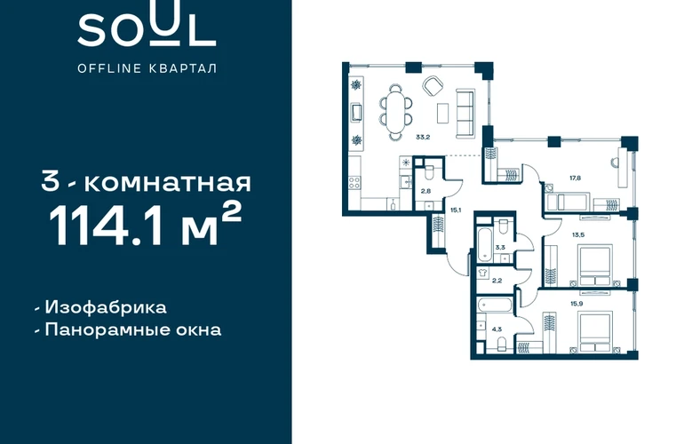 Цены указаны с условием 100% оплаты и стандартной ипотеки. Прямая продажа от застройщика! Продается 3-к. квартира квартира номер 715 общей площадью 114.1 кв.м. на 29-м этаже 29 этажного дома, Корпус 5. Без отделки. Проект бизнес-класса SOUL от девелопера FORMA. До метро Сокол 10 мин пешком. Архитектура от британского бюро SimpsonHaugh. Благоустройство дворов — Gillespies и GAFA. Территория состоит из культурного парка и приватных дворов. Озеленение в эстетике лесного оазиса. Насыщенное благоустройство: прогулочные тропинки, релакс-зоны, пряный и сенсорный сады, развивающие детские площадки и воркауты. В центре проекта объект культурного наследия — общественное пространство Изофабрика, построенная в 30-х годах по проекту архитектора Георгия Гольца. Здесь будут располагаться мастерские для взрослых и детей, выставочные залы, коворкинги, образовательный центр, рестораны и кафе. Квартиры с панорамными окнами, мастер-спальнями, гардеробными, классическими балконами и лоджиями, видовыми террасами. Высота потолков от 2,9 до 3,5 м. В проекте 2 детских сада на 100 и 200 малышей. Клубная гостиная, фитнес-рум, детская игровая комната, дизайнерские лобби, подземный паркинг и келлеры.О застройщике