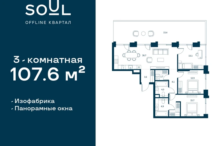 Семейная ипотека от 3,5% до 12 млн ₽. Прямая продажа от застройщика! Продается 3-к. квартира квартира номер 410 общей площадью 107.6 кв.м. на 19-м этаже 27 этажного дома, Корпус 4. С отделкой White Box . Проект бизнес-класса Soul от девелопера FORMA. До метро Сокол 11 мин пешком. Архитектура от британского бюро SimpsonHaugh. Благоустройство дворов — Gillespies. Центральная площадь с фонтанами и местами для отдыха. Оборудованные детские и спортивные площадки. В центре проекта объект культурного наследия — общественное пространство Изофабрика, построенная в 30-х годах по проекту архитектора Георгия Гольца. Здесь будут располагаться мастерские для взрослых и детей, образовательный центр, рестораны и кафе. Квартиры с панорамными окнами, французскими балконами, мастер-спальнями и гардеробными. Высота потолков от 3,1 м. На последнем этаже 3,5 м. В проекте 2 детских сада на 100 и 200 малышей. Фит-рум, коворкинг, дизайнерские лобби, подземный паркинг и келлеры.О застройщике