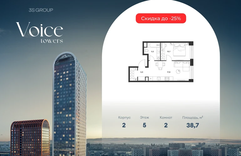 Рассрочка 0% без платежей и переплат. Семейная ипотека от 4,5% Продается уютная 1-комн. квартира площадью 38,7 кв.м на 5 этаже жилого комплекса бизнес-класса Voice Towers от 3S Group. Общая площадь: 38,7 кв.м., жилая: 18,1 кв.м., площадь кухни-гостиной: 17,8 кв.м., высота потолков: 3,12 м., санузел совмещенный. О проекте: Voice. Высокие стандарты жизни Мы уверены, что высокие идеалы неизменно помогают достигать высот. Создавая Voice, мы ориентировались на людей с высокими требованиями к качеству и безупречным вкусом. Башни жилого комплекса, сочетают элегантную форму с динамичной геометрией фасадов, устремляются ввысь и отвечают самым высоким стандартам строительства. Технологичность, воплощенная в архитектуре - это ваш, собственный Voice. Преимущества локации Близость к метро Текстильщики, БКЛ и МЦК Новохохловская (10 мин) Рядом природный заповедник и конно-спортивная база Кузьминки-Люблино Будущее окружение Проект Южный порт - Текстильщики с деловым центром Сити-2 Небоскребы высотой до 300м Культурный центр с амфитеатром Променад вдоль Москвы-реки и яхт-клуб Архитектура Проект от Архитектурной мастерской Алексея Ильина Две перпендикулярные башни с арочными вершинами Высокая башня: светло-серый металл Низкая башня: терракотовая керамика Благоустройство Внешняя зона: парковки, магазины, кафе Внутренний двор: закрытая территория с озеленением Шумозащитный экран Сезонное озеленение Встречи на высоте Гранд-лобби высотой 8м Дизайнерская мебель Умные скоростные лифты Услуги Детский центр с игровой зоной Фитнес-студия для жителейО застройщике