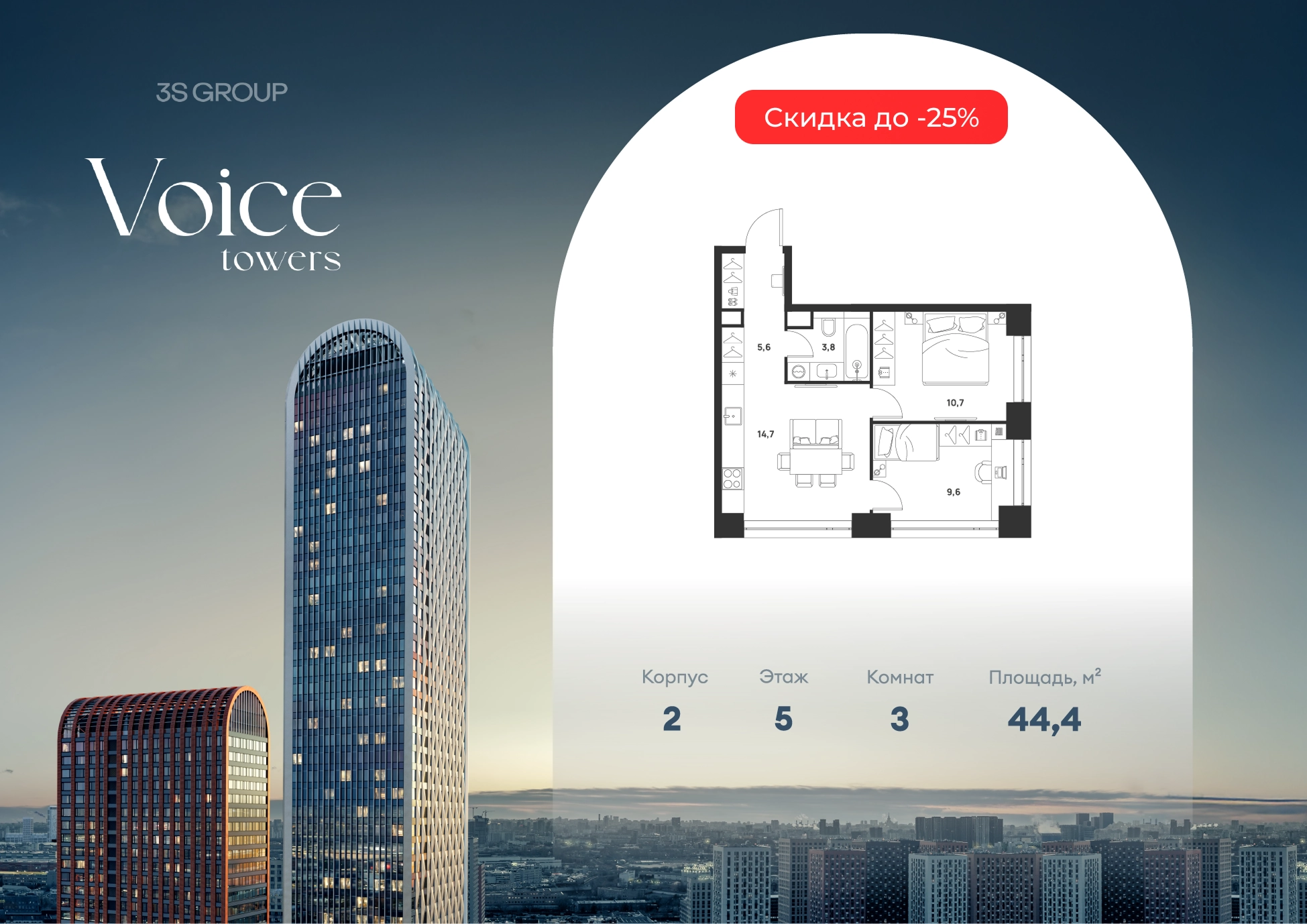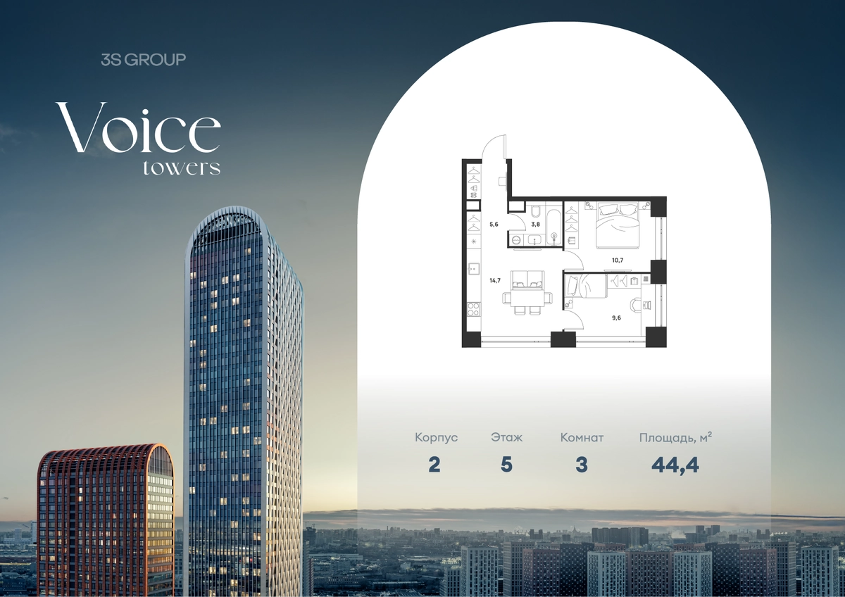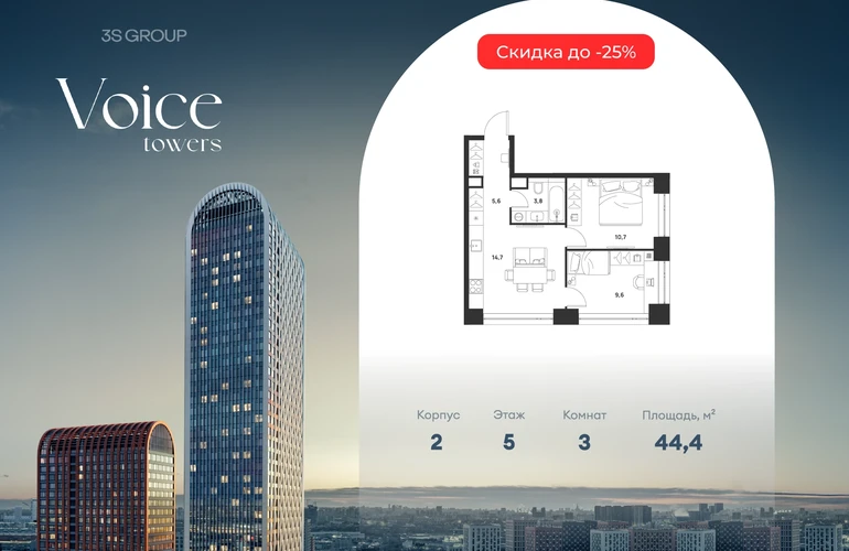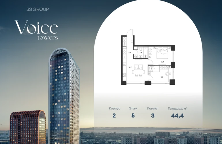 Ипотека от 3,5% на весь срок. Дополнительная скидка в офисе продаж! Продается уютная 2-комн. квартира площадью 44,4 кв.м на 5 этаже жилого комплекса бизнес-класса Voice Towers от 3S Group. Общая площадь: 44,4 кв.м., жилая: 28,7 кв.м., площадь кухни-гостиной: 14,7 кв.м., высокие потолки: 3,12 м., санузел совмещенный. О проекте: Voice. Высокие стандарты жизни Мы уверены, что высокие идеалы неизменно помогают достигать высот. Создавая Voice, мы ориентировались на людей с высокими требованиями к качеству и безупречным вкусом. Башни жилого комплекса, сочетают элегантную форму с динамичной геометрией фасадов, устремляются ввысь и отвечают самым высоким стандартам строительства. Технологичность, воплощенная в архитектуре - это ваш, собственный Voice. Преимущества локации Близость к метро Текстильщики, БКЛ и МЦК Новохохловская (10 мин) Рядом природный заповедник и конно-спортивная база Кузьминки-Люблино Будущее окружение Проект Южный порт - Текстильщики с деловым центром Сити-2 Небоскребы высотой до 300м Культурный центр с амфитеатром Променад вдоль Москвы-реки и яхт-клуб Архитектура Проект от Архитектурной мастерской Алексея Ильина Две перпендикулярные башни с арочными вершинами Высокая башня: светло-серый металл Низкая башня: терракотовая керамика Благоустройство Внешняя зона: парковки, магазины, кафе Внутренний двор: закрытая территория с озеленением Шумозащитный экран Сезонное озеленение Встречи на высоте Гранд-лобби высотой 8м Дизайнерская мебель Умные скоростные лифты Услуги Детский центр с игровой зоной Фитнес-студия для жителейО застройщике