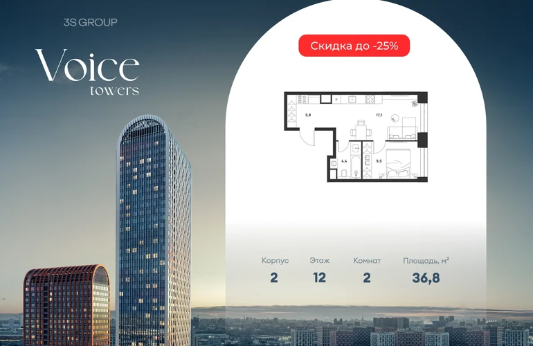 Рассрочка 0% без платежей и переплат. Семейная ипотека от 4,5% Продается уютная 1-комн. квартира площадью 36,8 кв.м на 12 этаже жилого комплекса бизнес-класса Voice Towers от 3S Group. Общая площадь: 36,8 кв.м., жилая: 16,8 кв.м., площадь кухни-гостиной: 17,1 кв.м., высота потолков: 3,12 м., санузел совмещенный. О проекте: Voice. Высокие стандарты жизни Мы уверены, что высокие идеалы неизменно помогают достигать высот. Создавая Voice, мы ориентировались на людей с высокими требованиями к качеству и безупречным вкусом. Башни жилого комплекса, сочетают элегантную форму с динамичной геометрией фасадов, устремляются ввысь и отвечают самым высоким стандартам строительства. Технологичность, воплощенная в архитектуре - это ваш, собственный Voice. Преимущества локации Близость к метро Текстильщики, БКЛ и МЦК Новохохловская (10 мин) Рядом природный заповедник и конно-спортивная база Кузьминки-Люблино Будущее окружение Проект Южный порт - Текстильщики с деловым центром Сити-2 Небоскребы высотой до 300м Культурный центр с амфитеатром Променад вдоль Москвы-реки и яхт-клуб Архитектура Проект от Архитектурной мастерской Алексея Ильина Две перпендикулярные башни с арочными вершинами Высокая башня: светло-серый металл Низкая башня: терракотовая керамика Благоустройство Внешняя зона: парковки, магазины, кафе Внутренний двор: закрытая территория с озеленением Шумозащитный экран Сезонное озеленение Встречи на высоте Гранд-лобби высотой 8м Дизайнерская мебель Умные скоростные лифты Услуги Детский центр с игровой зоной Фитнес-студия для жителейО застройщике