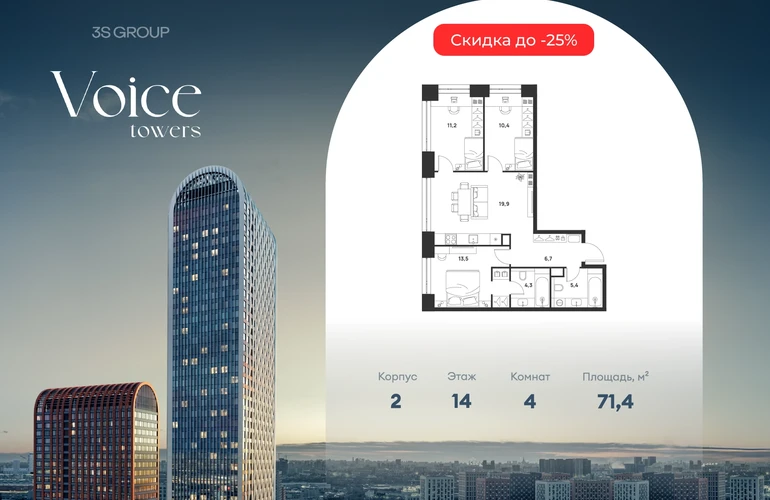 Ипотека от 3,5% на весь срок. Дополнительная скидка в офисе продаж! Продается уютная 3-комн. квартира площадью 71,4 кв.м на 14 этаже жилого комплекса бизнес-класса Voice Towers от 3S Group. Общая площадь: 71,4 кв.м., жилая: 49,8 кв.м., площадь кухни-гостиной: 19,9 кв.м., высокие потолки: 3,12 м., санузел совмещенный. О проекте: Voice. Высокие стандарты жизни Мы уверены, что высокие идеалы неизменно помогают достигать высот. Создавая Voice, мы ориентировались на людей с высокими требованиями к качеству и безупречным вкусом. Башни жилого комплекса, сочетают элегантную форму с динамичной геометрией фасадов, устремляются ввысь и отвечают самым высоким стандартам строительства. Технологичность, воплощенная в архитектуре - это ваш, собственный Voice. Преимущества локации Близость к метро Текстильщики, БКЛ и МЦК Новохохловская (10 мин) Рядом природный заповедник и конно-спортивная база Кузьминки-Люблино Будущее окружение Проект Южный порт - Текстильщики с деловым центром Сити-2 Небоскребы высотой до 300м Культурный центр с амфитеатром Променад вдоль Москвы-реки и яхт-клуб Архитектура Проект от Архитектурной мастерской Алексея Ильина Две перпендикулярные башни с арочными вершинами Высокая башня: светло-серый металл Низкая башня: терракотовая керамика Благоустройство Внешняя зона: парковки, магазины, кафе Внутренний двор: закрытая территория с озеленением Шумозащитный экран Сезонное озеленение Встречи на высоте Гранд-лобби высотой 8м Дизайнерская мебель Умные скоростные лифты Услуги Детский центр с игровой зоной Фитнес-студия для жителейО застройщике