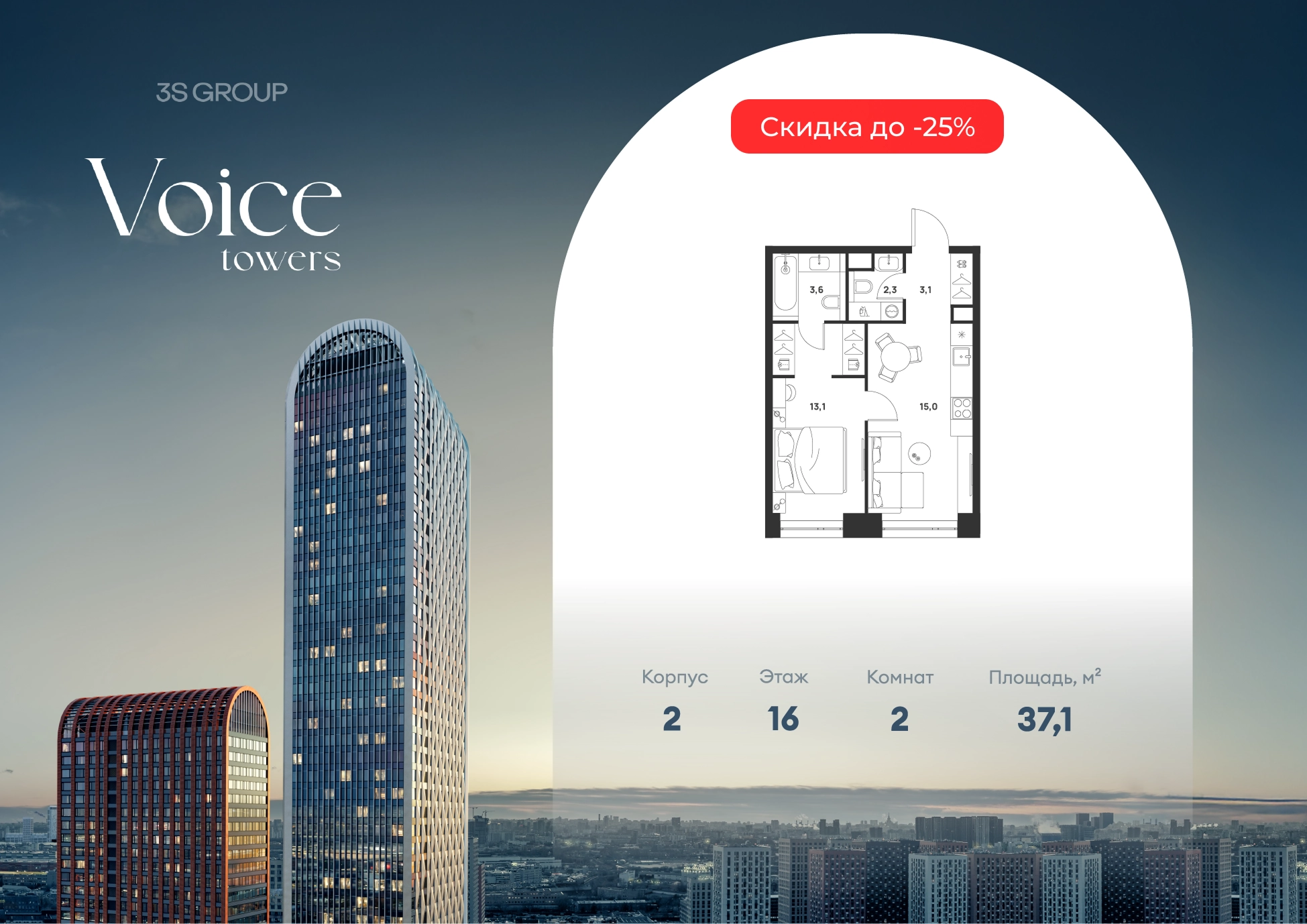Ипотека от 3,5% на весь срок. Дополнительная скидка в офисе продаж! Продается уютная 1-комн. квартира площадью 37,1 кв.м на 16 этаже жилого комплекса бизнес-класса Voice Towers от 3S Group. Общая площадь: 37,1 кв.м., жилая: 23,2 кв.м., площадь кухни-гостиной: 15 кв.м., высокие потолки: 3,12 м., санузел раздельный. О проекте: Voice. Высокие стандарты жизни Мы уверены, что высокие идеалы неизменно помогают достигать высот. Создавая Voice, мы ориентировались на людей с высокими требованиями к качеству и безупречным вкусом. Башни жилого комплекса, сочетают элегантную форму с динамичной геометрией фасадов, устремляются ввысь и отвечают самым высоким стандартам строительства. Технологичность, воплощенная в архитектуре - это ваш, собственный Voice. Преимущества локации Близость к метро Текстильщики, БКЛ и МЦК Новохохловская (10 мин) Рядом природный заповедник и конно-спортивная база Кузьминки-Люблино Будущее окружение Проект Южный порт - Текстильщики с деловым центром Сити-2 Небоскребы высотой до 300м Культурный центр с амфитеатром Променад вдоль Москвы-реки и яхт-клуб Архитектура Проект от Архитектурной мастерской Алексея Ильина Две перпендикулярные башни с арочными вершинами Высокая башня: светло-серый металл Низкая башня: терракотовая керамика Благоустройство Внешняя зона: парковки, магазины, кафе Внутренний двор: закрытая территория с озеленением Шумозащитный экран Сезонное озеленение Встречи на высоте Гранд-лобби высотой 8м Дизайнерская мебель Умные скоростные лифты Услуги Детский центр с игровой зоной Фитнес-студия для жителейО застройщике