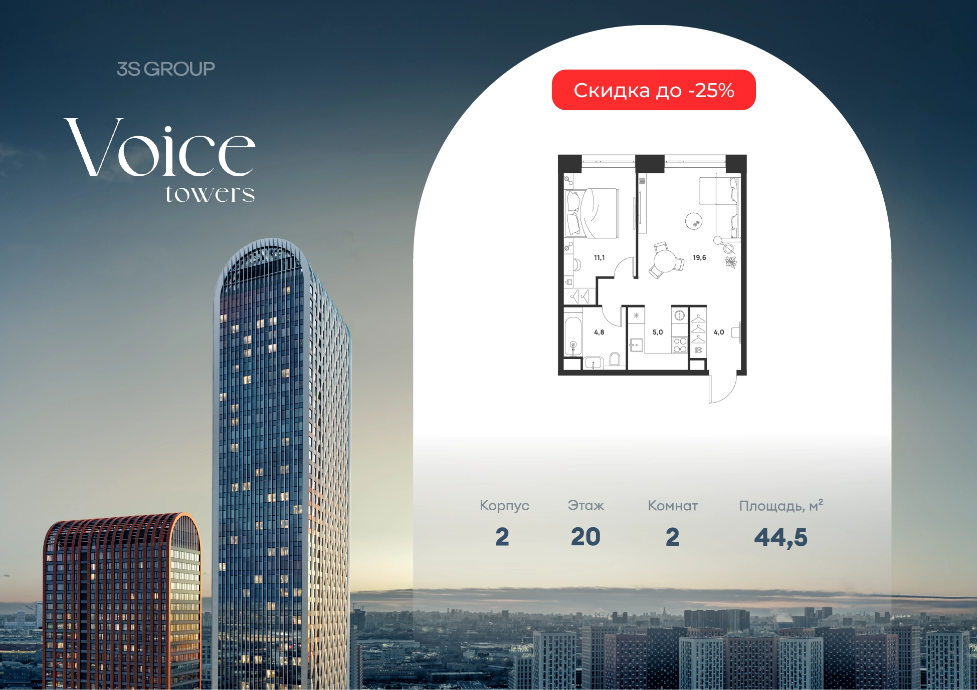 Ипотека от 3,5% на весь срок. Дополнительная скидка в офисе продаж! Продается уютная 1-комн. квартира площадью 44,5 кв.м на 20 этаже жилого комплекса бизнес-класса Voice Towers от 3S Group. Общая площадь: 44,5 кв.м., жилая: 30,7 кв.м., площадь кухни-гостиной: 24,6 кв.м., высокие потолки: 3,02 м., санузел совмещенный. О проекте: Voice. Высокие стандарты жизни Мы уверены, что высокие идеалы неизменно помогают достигать высот. Создавая Voice, мы ориентировались на людей с высокими требованиями к качеству и безупречным вкусом. Башни жилого комплекса, сочетают элегантную форму с динамичной геометрией фасадов, устремляются ввысь и отвечают самым высоким стандартам строительства. Технологичность, воплощенная в архитектуре - это ваш, собственный Voice. Преимущества локации Близость к метро Текстильщики, БКЛ и МЦК Новохохловская (10 мин) Рядом природный заповедник и конно-спортивная база Кузьминки-Люблино Будущее окружение Проект Южный порт - Текстильщики с деловым центром Сити-2 Небоскребы высотой до 300м Культурный центр с амфитеатром Променад вдоль Москвы-реки и яхт-клуб Архитектура Проект от Архитектурной мастерской Алексея Ильина Две перпендикулярные башни с арочными вершинами Высокая башня: светло-серый металл Низкая башня: терракотовая керамика Благоустройство Внешняя зона: парковки, магазины, кафе Внутренний двор: закрытая территория с озеленением Шумозащитный экран Сезонное озеленение Встречи на высоте Гранд-лобби высотой 8м Дизайнерская мебель Умные скоростные лифты Услуги Детский центр с игровой зоной Фитнес-студия для жителейО застройщике