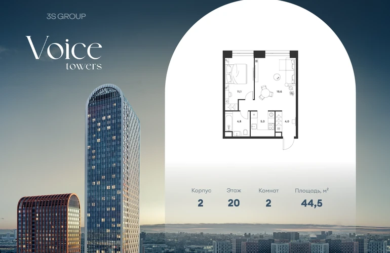 Ипотека от 3,5% на весь срок. Дополнительная скидка в офисе продаж! Продается уютная 1-комн. квартира площадью 44,5 кв.м на 20 этаже жилого комплекса бизнес-класса Voice Towers от 3S Group. Общая площадь: 44,5 кв.м., жилая: 30,7 кв.м., площадь кухни-гостиной: 24,6 кв.м., высокие потолки: 3,02 м., санузел совмещенный. О проекте: Voice. Высокие стандарты жизни Мы уверены, что высокие идеалы неизменно помогают достигать высот. Создавая Voice, мы ориентировались на людей с высокими требованиями к качеству и безупречным вкусом. Башни жилого комплекса, сочетают элегантную форму с динамичной геометрией фасадов, устремляются ввысь и отвечают самым высоким стандартам строительства. Технологичность, воплощенная в архитектуре - это ваш, собственный Voice. Преимущества локации Близость к метро Текстильщики, БКЛ и МЦК Новохохловская (10 мин) Рядом природный заповедник и конно-спортивная база Кузьминки-Люблино Будущее окружение Проект Южный порт - Текстильщики с деловым центром Сити-2 Небоскребы высотой до 300м Культурный центр с амфитеатром Променад вдоль Москвы-реки и яхт-клуб Архитектура Проект от Архитектурной мастерской Алексея Ильина Две перпендикулярные башни с арочными вершинами Высокая башня: светло-серый металл Низкая башня: терракотовая керамика Благоустройство Внешняя зона: парковки, магазины, кафе Внутренний двор: закрытая территория с озеленением Шумозащитный экран Сезонное озеленение Встречи на высоте Гранд-лобби высотой 8м Дизайнерская мебель Умные скоростные лифты Услуги Детский центр с игровой зоной Фитнес-студия для жителейО застройщике