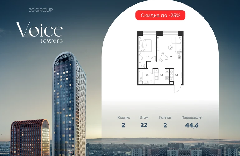 Ипотека от 3,5% на весь срок. Дополнительная скидка в офисе продаж! Продается уютная 1-комн. квартира площадью 44,6 кв.м на 22 этаже жилого комплекса бизнес-класса Voice Towers от 3S Group. Общая площадь: 44,6 кв.м., жилая: 30,7 кв.м., площадь кухни-гостиной: 24,6 кв.м., высокие потолки: 3,12 м., санузел совмещенный. О проекте: Voice. Высокие стандарты жизни Мы уверены, что высокие идеалы неизменно помогают достигать высот. Создавая Voice, мы ориентировались на людей с высокими требованиями к качеству и безупречным вкусом. Башни жилого комплекса, сочетают элегантную форму с динамичной геометрией фасадов, устремляются ввысь и отвечают самым высоким стандартам строительства. Технологичность, воплощенная в архитектуре - это ваш, собственный Voice. Преимущества локации Близость к метро Текстильщики, БКЛ и МЦК Новохохловская (10 мин) Рядом природный заповедник и конно-спортивная база Кузьминки-Люблино Будущее окружение Проект Южный порт - Текстильщики с деловым центром Сити-2 Небоскребы высотой до 300м Культурный центр с амфитеатром Променад вдоль Москвы-реки и яхт-клуб Архитектура Проект от Архитектурной мастерской Алексея Ильина Две перпендикулярные башни с арочными вершинами Высокая башня: светло-серый металл Низкая башня: терракотовая керамика Благоустройство Внешняя зона: парковки, магазины, кафе Внутренний двор: закрытая территория с озеленением Шумозащитный экран Сезонное озеленение Встречи на высоте Гранд-лобби высотой 8м Дизайнерская мебель Умные скоростные лифты Услуги Детский центр с игровой зоной Фитнес-студия для жителей